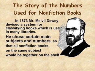 The document summarizes the Dewey Decimal System, which was devised in 1873 by Melvil Dewey to classify nonfiction books in libraries. It divides books into 10 main categories based on their subject. Each category is explained using a caveman analogy, imagining how a caveman might categorize information based on questions like "Who am I?" or "How can I understand nature?". The categories range from general knowledge to geography and history.
