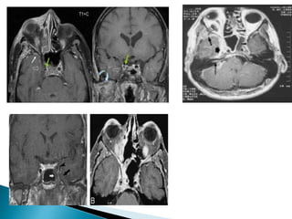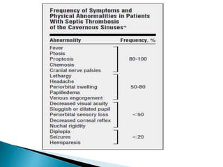 2. Septic cavernous sinus thrombosis is usually caused by infection spreading from nearby sites like the nose, orbit, or teeth. Common symptoms include proptosis, ophthalmoplegia, and fever.