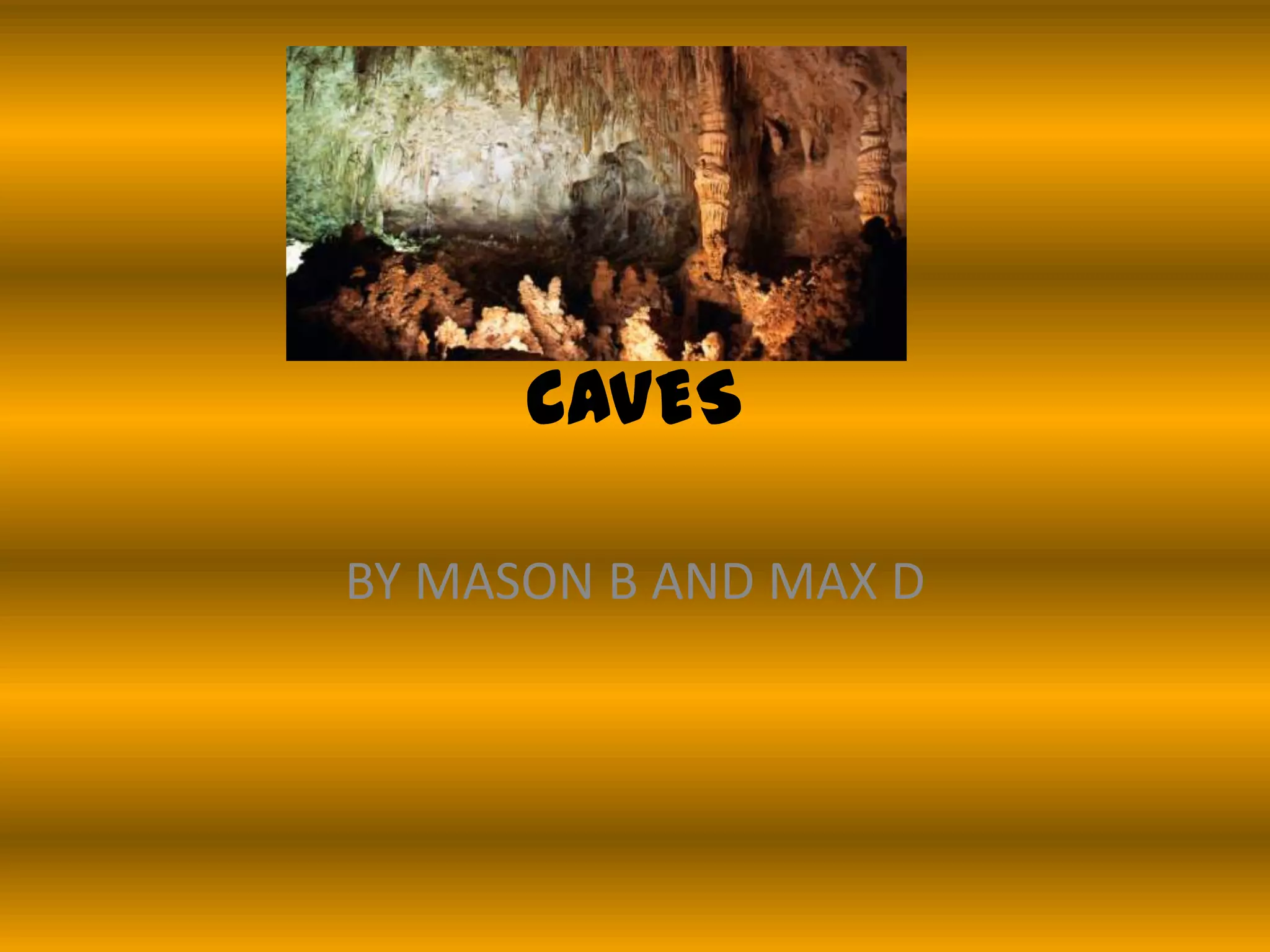 Caves are dark, wet habitats that support unique plant and animal life adapted to live without light. Common cave animals include blind salamanders, fish, crayfish and bats, while bacteria and fungi serve as cave plants. Caves have three zones - the entrance, twilight and dark zones - and come in different types like ice caves, sea caves and lava tubes. Cave life exhibits adaptations like lack of vision, use of guano for energy, and echolocation in bats.