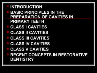 This document discusses cavity preparation in primary teeth. It covers the basic principles, which involve opening the cavity with a high-speed bur and then eliminating caries from all walls. It describes cavity preparations for different tooth surfaces and classes of cavities. For class I cavities, it recommends rounding internal line angles and converging side walls. For class II cavities, it suggests dovetail-shaped occlusal steps and convergence of proximal walls. Stainless steel crowns are indicated for restoring heavily decayed primary molars.