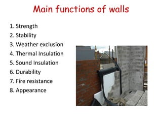 Cavity walls consist of two masonry skins separated by a hollow space. The cavity serves to drain water out of the absorbent masonry skins through weep holes. Cavity wall insulation such as mineral wool, polystyrene beads, or urea formaldehyde foam is used to reduce heat loss by filling the air space. Wall ties connect the two skins to prevent separation, and are spaced according to building regulations. Weep holes above windows and doors allow moisture in the cavity to escape. Cavity walls provide advantages like insulation from sound and moisture, reduced heat transfer, and lower foundation loads.