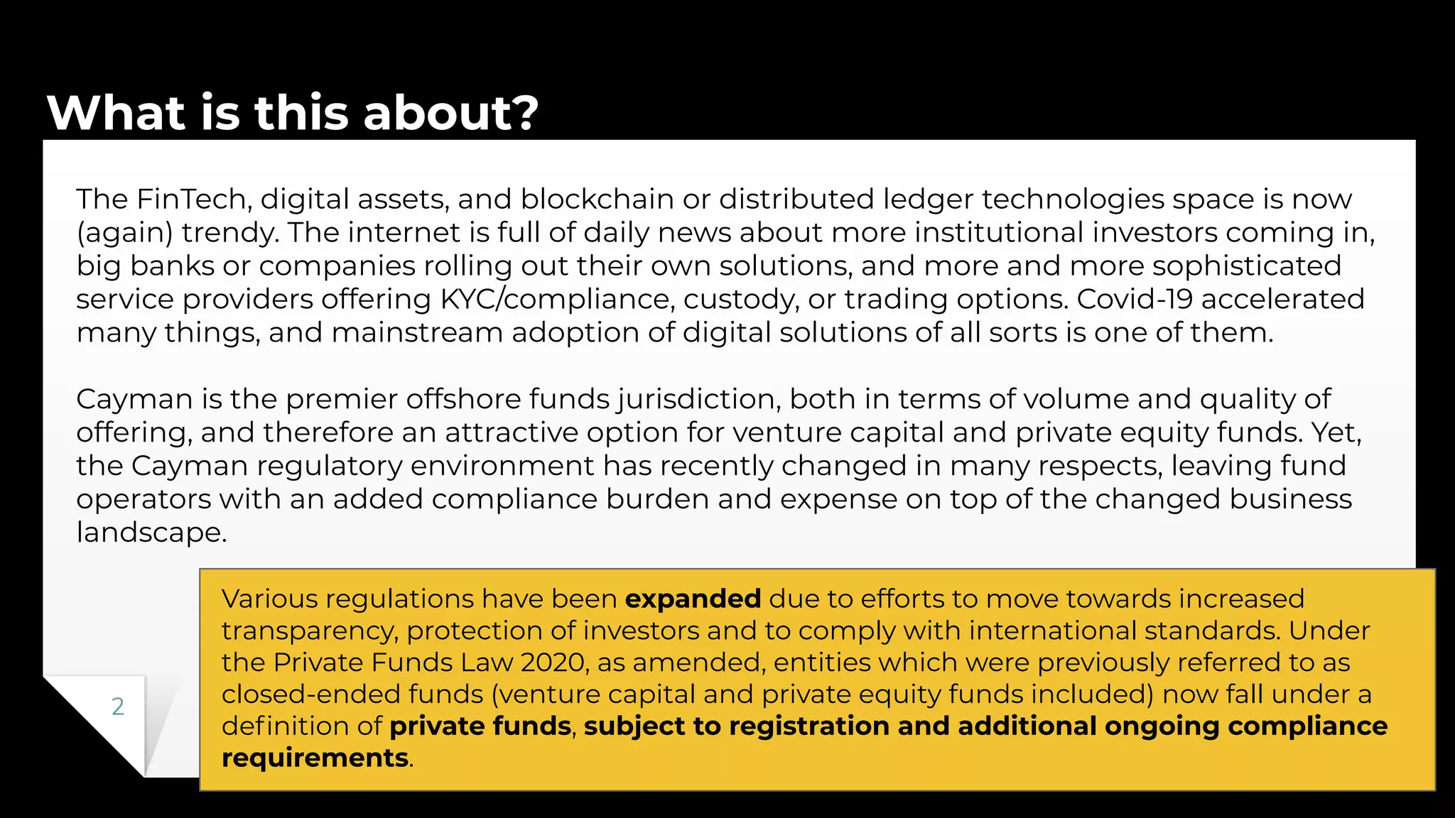 The document outlines the regulatory landscape for private funds in the Cayman Islands, specifically regarding compliance requirements under the Private Funds Law 2020. It details the necessity for registration, auditing, and the obligations of fund managers to maintain asset segregation and ensure regulatory adherence. Additionally, it emphasizes the importance of adapting to changes in compliance and offers guidance for fund operators navigating the evolving landscape of digital assets and blockchain technology.