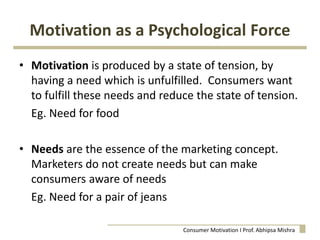 The document discusses consumer motivation as a psychological force driving the fulfillment of physiological and psychological needs through product purchase and consumption. It categorizes needs into physiological, safety, love, financial resources, social image, pleasure, possession, and information, emphasizing how these needs influence consumer behavior and decision-making. The text also explores the dynamics of motivation, different types of motivational conflicts, and strategies for marketers to effectively motivate consumers.