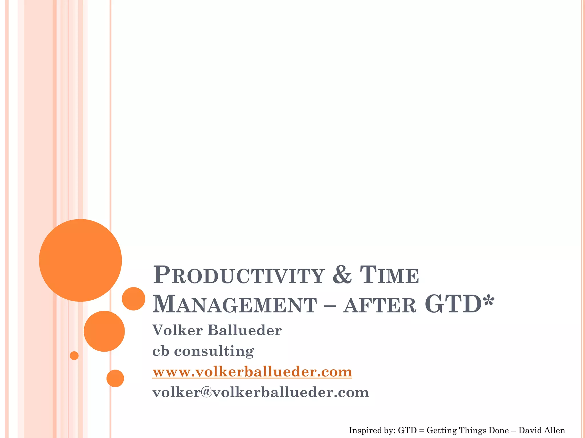 The document provides an overview of productivity principles from Getting Things Done (GTD) by David Allen and additional insights from Volker Ballueder. Some key points covered include: