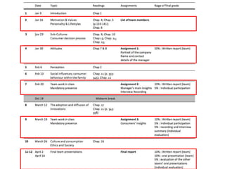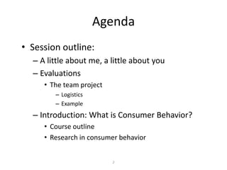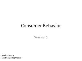 This document provides an overview and agenda for a consumer behavior course. It introduces the instructor, Sandra Laporte, and outlines her areas of expertise. The document then reviews the course objectives, which are to understand how consumer behavior insights can benefit managers and develop analytical skills. It outlines the group project, where students will create a consumer profile for a brand. Finally, it introduces the topic of consumer behavior, defining it and outlining some of the key influences on consumer decision-making that will be covered throughout the course.