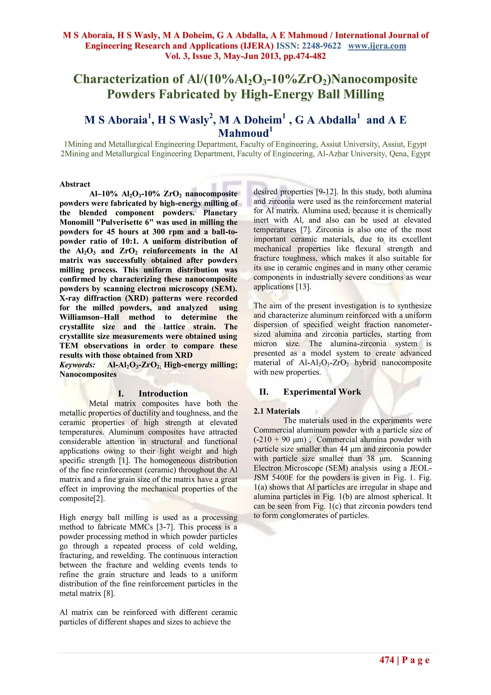 The study investigates the fabrication and characterization of aluminum reinforced with 10% alumina and 10% zirconia through high-energy ball milling. The milling process was conducted for up to 45 hours, achieving a uniform distribution of reinforcements in the aluminum matrix, confirmed through various analyses including scanning electron microscopy and X-ray diffraction. Results indicate that higher milling times lead to reduced crystallite size and increased lattice strain, with microstructural observations revealing significant changes in particle distribution and size over time.