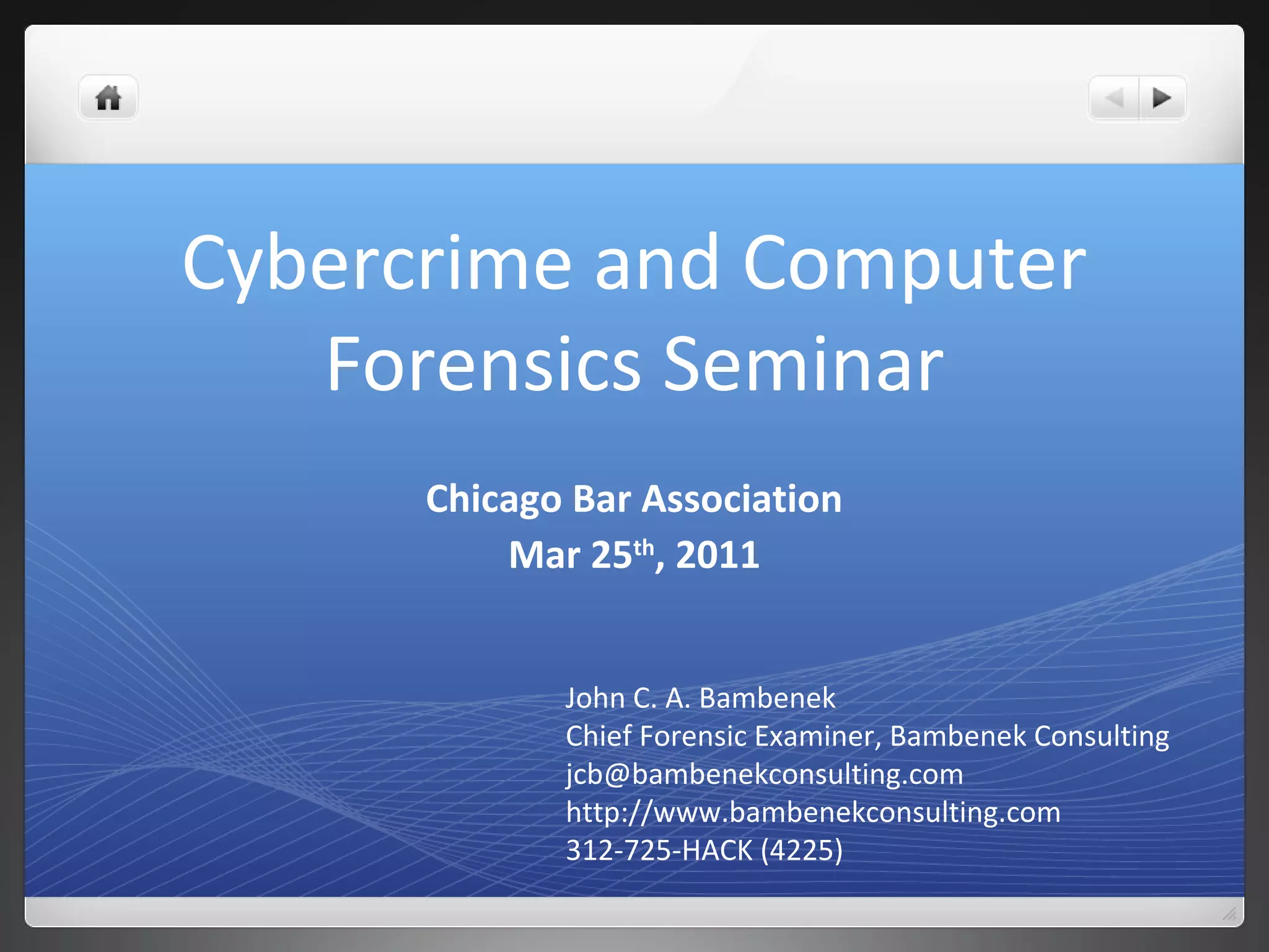 The seminar covers various aspects of cybercrime and computer forensics, including types of computer crime, legal issues, and the importance of chain of custody in evidence collection. Key topics include the differences between incident response and forensics, data acquisition methods, as well as tools like hashing for ensuring data integrity. Additionally, the seminar emphasizes the complexity of evidence collection from hard drives, memory, networks, and other digital sources.