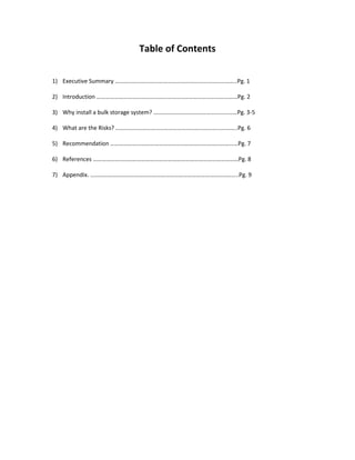 The document proposes installing a bulk chemical storage system at Rich's Ice Cream to improve safety, organization and reduce costs. Currently, chemicals are delivered weekly in 55-gallon drums, requiring manual handling of 6 drums. This poses safety risks and costs $7,100 annually in chemicals and freight. The recommendation is to purchase two 300-gallon storage tanks, install new transfer pumps, and schedule training to reduce safety risks and costs with a return on investment of 6.75 months.