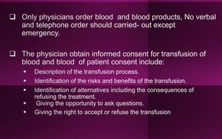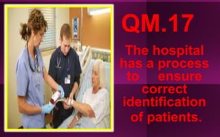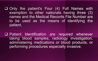 This document outlines various hospital protocols and procedures related to patient safety, including ensuring correct patient identification, preventing wrong site/procedure errors, and proper handling of blood products. It discusses the surgical safety checklist that must be performed before procedures, including sign in, time out, and sign out steps. Site marking protocol and exemptions are covered. Risk assessment for venous thromboembolism is also mentioned.