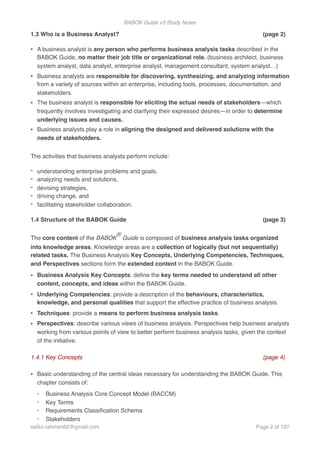 1. The BABOK Guide defines the practice of business analysis and provides commonly accepted practices to help practitioners discuss and define the necessary skills. It describes tasks in six knowledge areas.