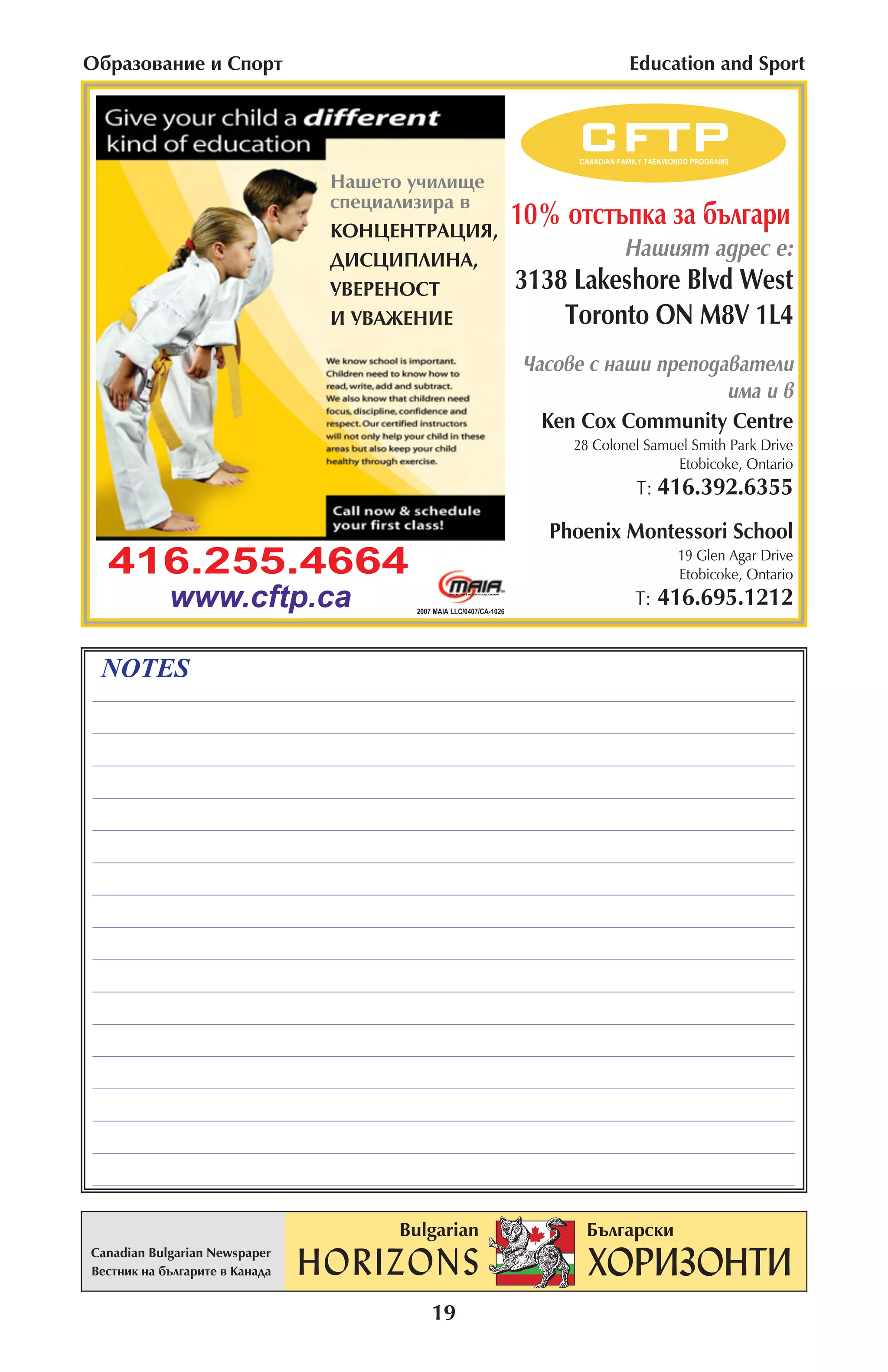 This document provides information about the Canadian Family Taekwondo Program (CFTP), including that it specializes in taekwondo instruction for families and children. It lists the address and contact information for CFTP locations in Toronto and Etobicoke, Ontario. It also notes that CFTP classes are available at the Ken Cox Community Centre and Phoenix Montessori School in Etobicoke.