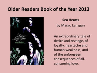 The document lists the winners of the 2013 CBCA Awards across five categories: Older Readers Book of the Year, Younger Readers Book of the Year, Early Childhood Book of the Year, Picture Book of the Year, and Eve Pownall Book of the Year. For each category, it provides the title of the winning book, author, and a one to two sentence description.