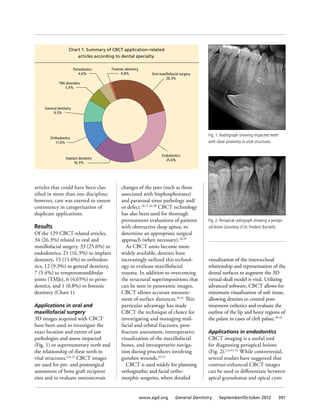 This article reviews the clinical applications of cone beam computed tomography (CBCT) in dentistry as described in 129 peer-reviewed publications from 1998 to 2010. The literature review found that CBCT has been used for oral and maxillofacial surgery, endodontics, implant dentistry, orthodontics, temporomandibular joint disorders, periodontics, and forensic dentistry. Specifically, CBCT provides advantages over 2D imaging such as a lack of superimposition, accurate measurements, and 3D visualization which has made it useful for applications like dental trauma assessment, implant planning, endodontic diagnosis, and orthognathic surgery planning.