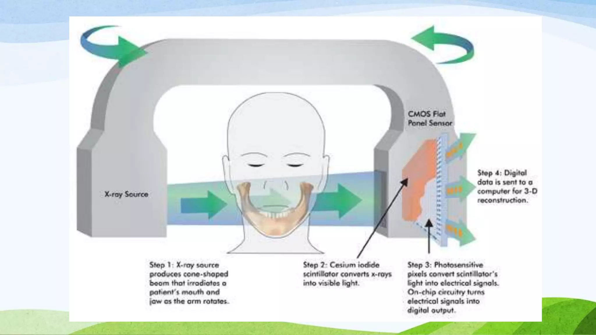 The document discusses Cone Beam Computed Tomography (CBCT) in orthodontics, highlighting its advantages over conventional X-ray imaging, including rapid and painless 3D imaging capabilities. CBCT offers detailed views of facial structures and assists in various applications such as implant site assessment, diagnosing temporomandibular joint issues, and surgical planning. The conclusion emphasizes that CBCT has transformed dental imaging by providing accurate, high-resolution images at lower radiation doses and costs.