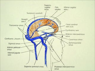 1. The document discusses cerebral blood flow, the blood-brain barrier, and cerebrospinal fluid.
