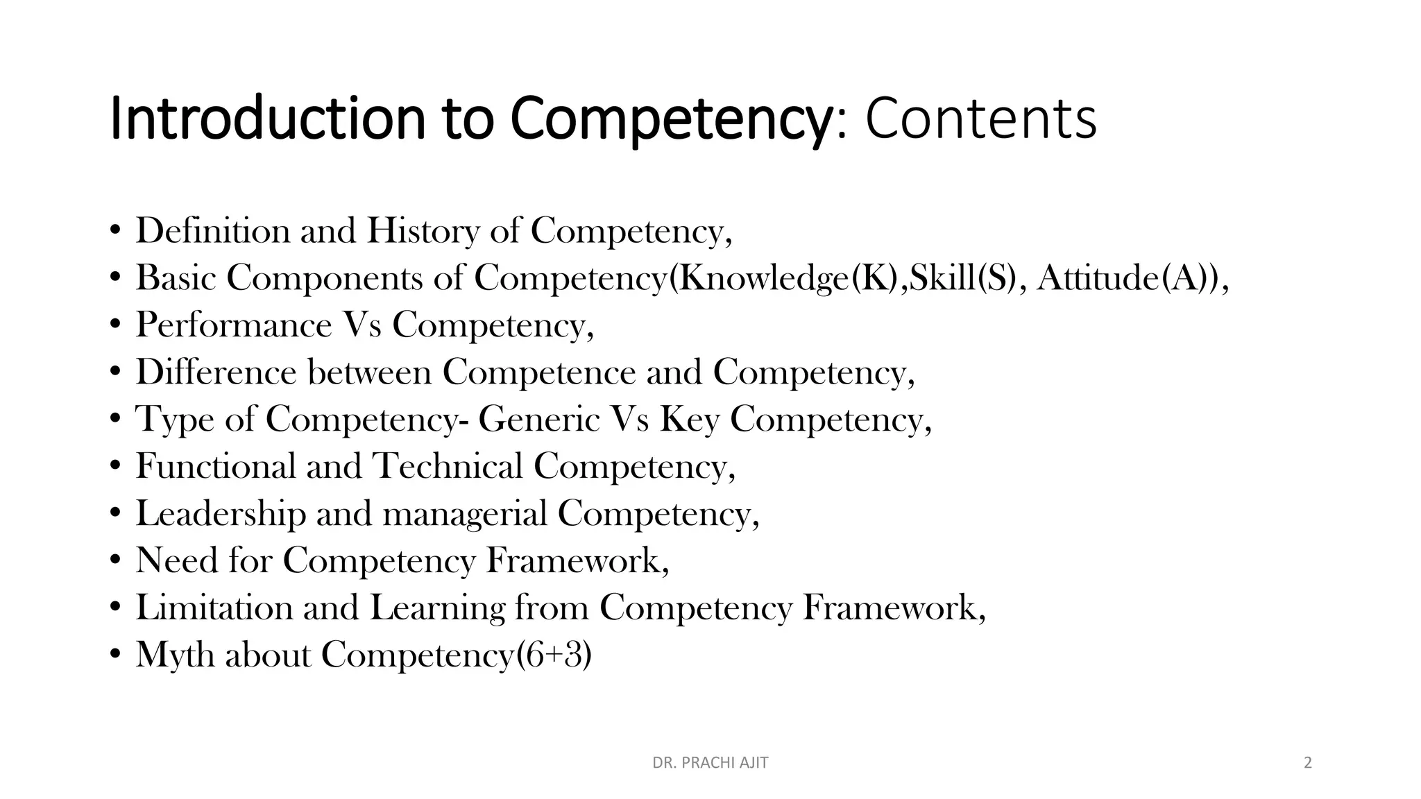 The document introduces the concept of competency within the HRM specialization for an MBA course, detailing its definition, history, basic components, and differences between competence and competency. It also discusses various types of competencies such as functional, technical, leadership, and managerial, along with the importance of a competency framework and its limitations. Additionally, it addresses common myths surrounding competencies and includes references for further reading.