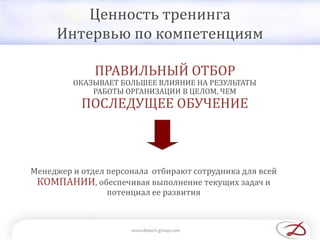 Документ описывает внедрение и эффективность интервью по компетенциям в различных компаниях, включая sanofi-aventis и rehau, с целью улучшения отбора сотрудников и повышения качества найма. В нем представлены бизнес-кейсы, в которых консультанты компании detech обучали менеджеров проводить структурированные интервью, разрабатывали руководства и модели компетенций. В результате этих усилий компании смогли оптимизировать процессы подбора персонала и добиться улучшения результатов в своей деятельности.