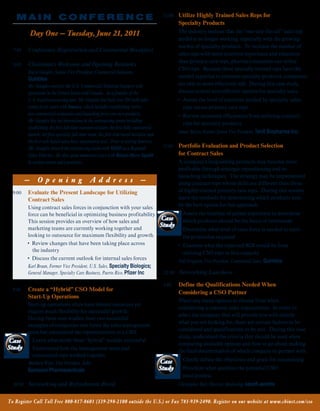 This document provides an agenda for the "Contract Sales Strategies for Bio/Pharmaceutical Companies" conference taking place on June 21-22, 2011 in Philadelphia, PA. The agenda includes sessions on evaluating contract sales organizations (CSOs) and their use, selecting the right CSO partner, aligning CSOs with internal sales forces, and leveraging alternative sales channels. Featured speakers represent major pharmaceutical companies and CSOs. The conference aims to provide strategies and case studies on optimizing the use of CSOs for business profitability.