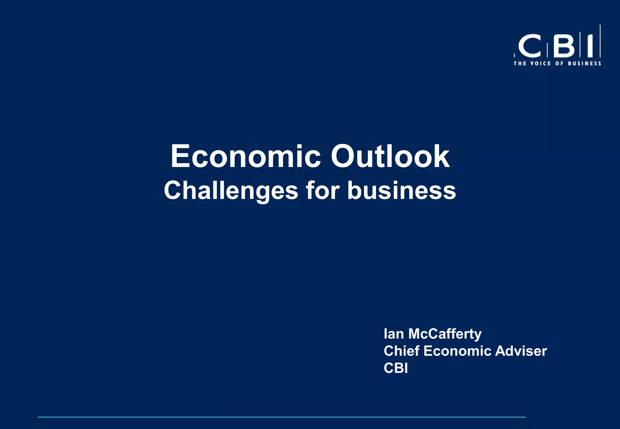 The document discusses the economic outlook and challenges for businesses, highlighting a divergent and uncertain global recovery influenced by various factors including commodity prices, supply chain disruptions, and the eurozone crisis. It indicates that while advanced economies are experiencing modest recovery, emerging market economies are expected to underpin global growth, although risks remain from oil prices and political tensions. The UK faces significant challenges with austerity measures impacting growth and increasing unemployment, requiring a shift towards a new growth model.