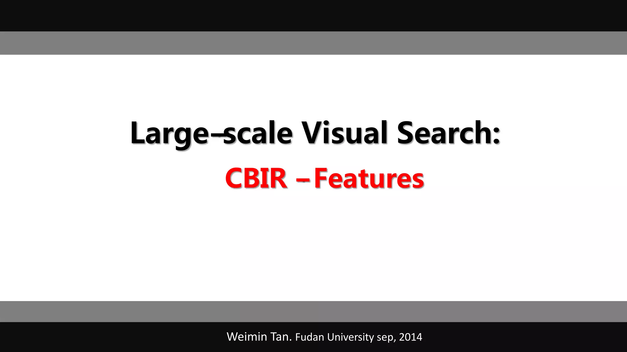 This document discusses various image features that can be used for large-scale visual search and content-based image retrieval (CBIR). It describes both high-level semantic features and low-level visual features that can be extracted from images. For low-level features, it outlines several popular global features like color histograms, color moments, texture descriptors using gray-level co-occurrence matrices (GLCM), shape context, and GIST. It also discusses commonly used local feature detectors like Harris corner detector, SIFT, and descriptors like SIFT, SURF, BRIEF.