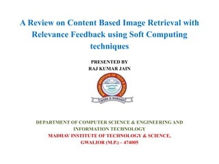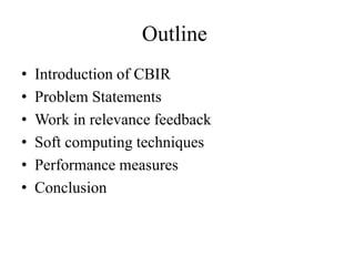 This document provides an overview of content-based image retrieval with relevance feedback using soft computing techniques. It discusses CBIR and the problems with semantic gaps between low-level features and high-level semantics. Relevance feedback is introduced as a technique to refine queries to reduce this gap, but it decreases system performance. The document then reviews related work applying machine learning methods like SVM and AdaBoost to relevance feedback. It also introduces soft computing methods like neural networks, genetic algorithms, and fuzzy clustering to improve retrieval efficiency and performance. Finally, it discusses measures like precision and recall for evaluating system performance.