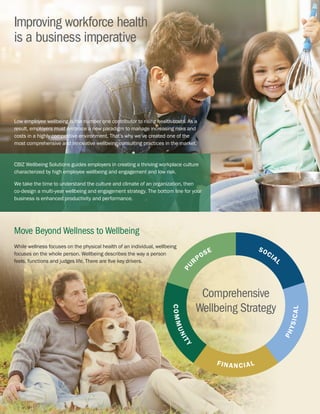 CBIZ Wellbeing Solutions focuses on enhancing employee wellbeing to reduce health costs and improve workplace culture. The company develops tailored multi-year strategies that address the five key drivers of wellbeing, leading to increased productivity, engagement, and overall business performance. With a robust compliance and support framework, CBIZ helps organizations navigate health care regulations while promoting a healthy work environment and sustainable lifestyle changes.