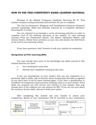 This document appears to be a training module for the competency-based qualification of Computer Hardware Servicing NC II. It outlines the learning outcomes and assessments trainees must complete to achieve certification. The module provides information sheets, task sheets, and other learning activities to help trainees independently develop the required knowledge and skills to diagnose and troubleshoot computer systems. It emphasizes independent and self-paced learning with trainer assistance available.