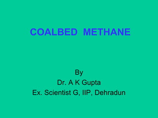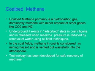 Coalbed methane exists naturally within coal deposits and can be extracted through drilling wells. As coal is buried deeper underground over time, microbial and thermal processes generate methane that gets stored in the coal. Technology has been developed to safely extract this methane by reducing reservoir pressure and allowing the gas to desorb from the coal. The United States has successfully commercialized coalbed methane extraction through thousands of wells. India also has significant coalbed methane potential across its major coal basins, with initial exploration showing good gas contents. Commercial development of this resource could help meet India's growing natural gas demand and improve energy security.