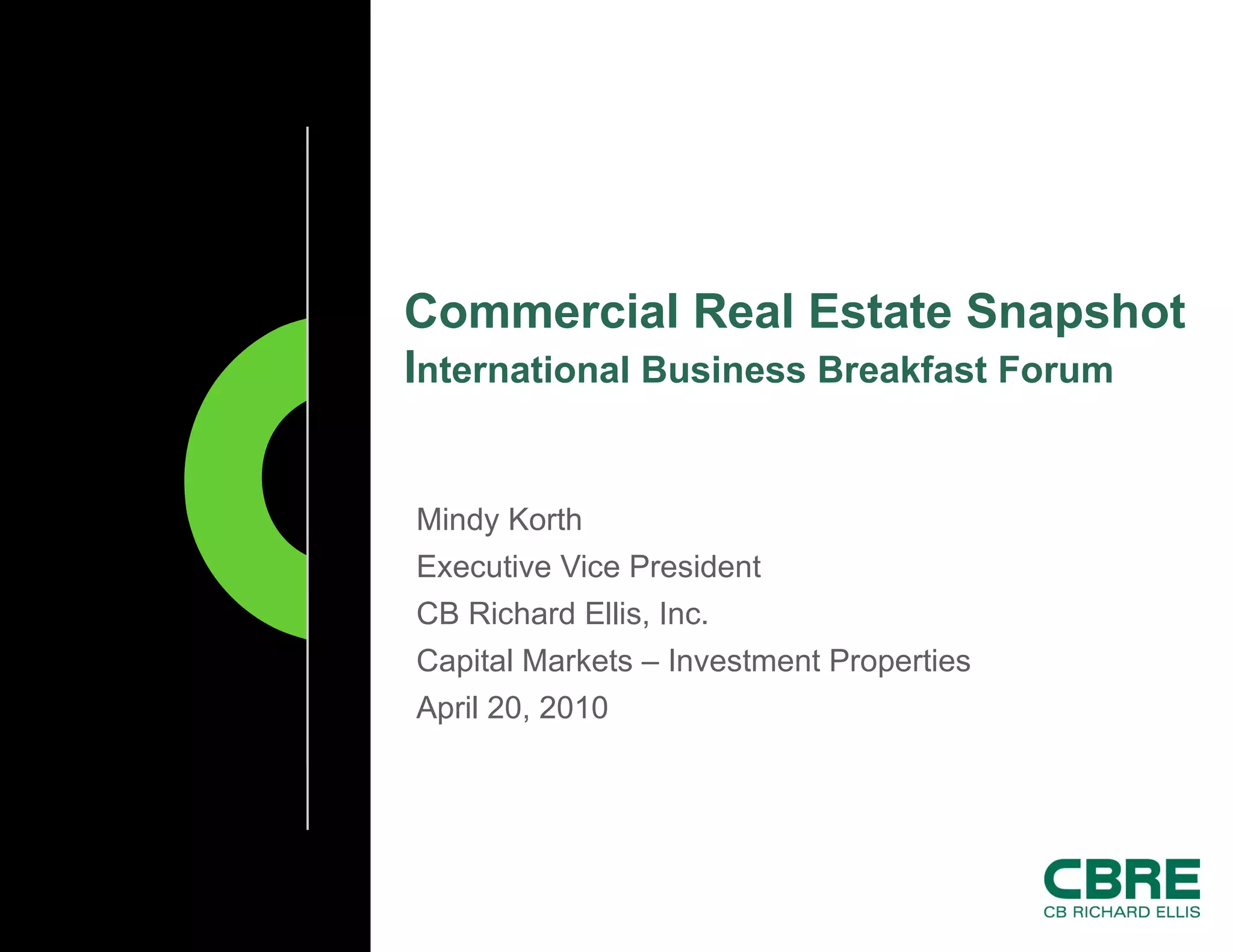 The document provides commercial real estate sales data for the first quarter of 2010, including the number of transactions, average price per square foot, and total transfer amount for office, retail, and industrial properties. It shows that there were 15 total transactions, with office having 2 transactions at $60.70 per square foot and $61,751,227 total, retail having 4 transactions at $135.33 per square foot and $6,585,550 total, and industrial having 9 transactions at $60.95 per square foot and $24,800,000 total. It also provides data on 19 lender-related transfers.