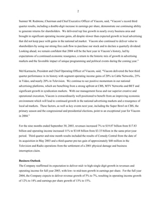 Viacom reported record third quarter 2003 results, with revenues increasing 5% to $6.60 billion and operating income rising 7% to $1.38 billion. Advertising revenues grew 8% to $2.88 billion. Earnings per share increased to $0.40 from $0.36 in the prior year. The company expects continued growth in 2004, forecasting revenue growth of 5-7% and earnings per share growth of 13-15%. Segment operating income rose significantly across Cable Networks, Television, and Video. The company reiterated 2003 guidance and sees strong growth continuing into 2004.