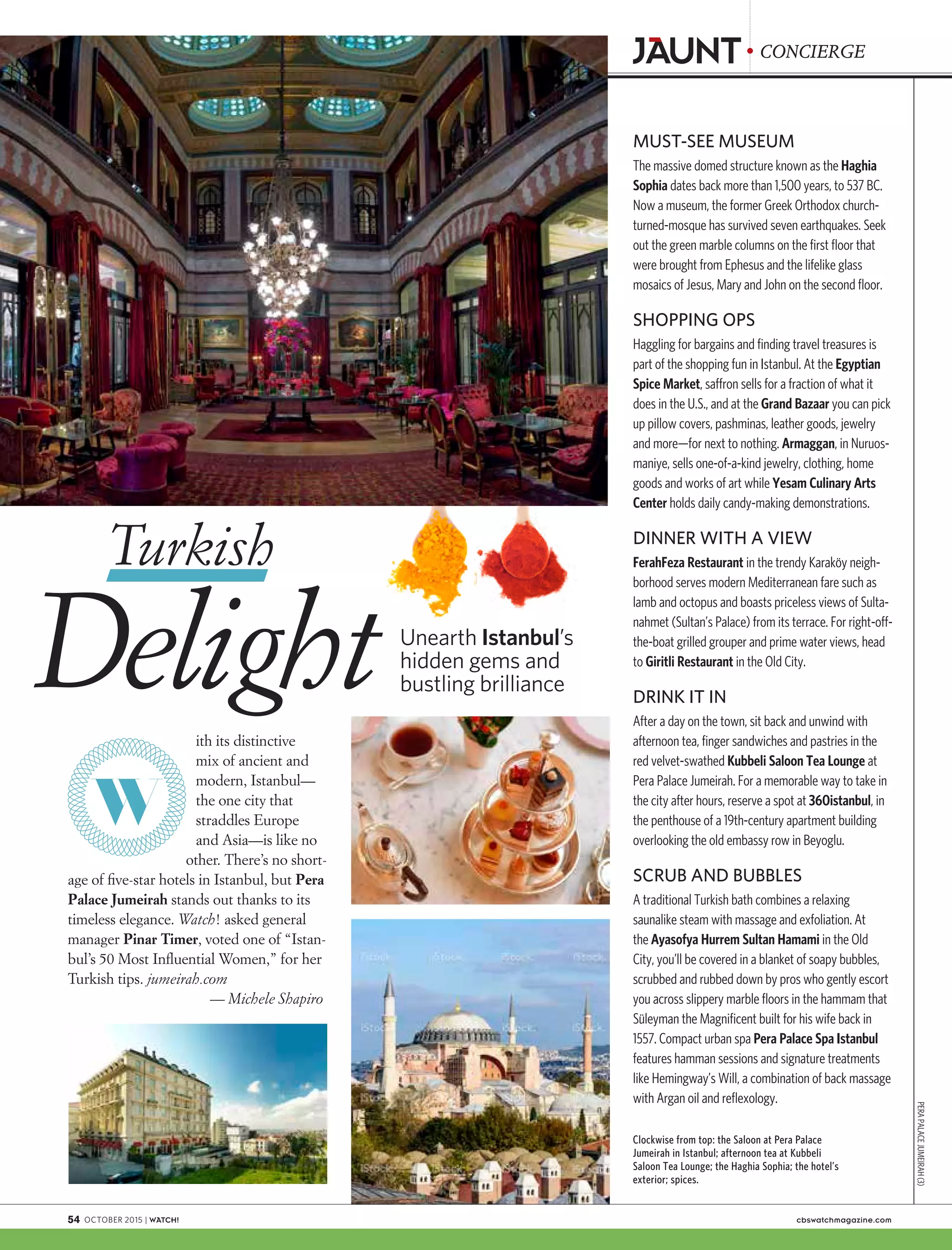 This document provides travel tips and recommendations for visiting Istanbul, Turkey. It highlights several must-see attractions, including the historic Hagia Sophia museum with its green marble columns and glass mosaics. It also recommends shopping at the Egyptian Spice Market and Grand Bazaar for bargains. For dining, it suggests the FerahFeza Restaurant for its Mediterranean food and views of the Sultan's Palace, or Giritli Restaurant for grilled seafood and waterfront setting. It also describes relaxing activities like afternoon tea at the Kubbeli Saloon Tea Lounge and nighttime views from 360istanbul rooftop bar. Traditional Turkish baths at locations like Ayasofya Hurrem Sultan Hamami provide ex