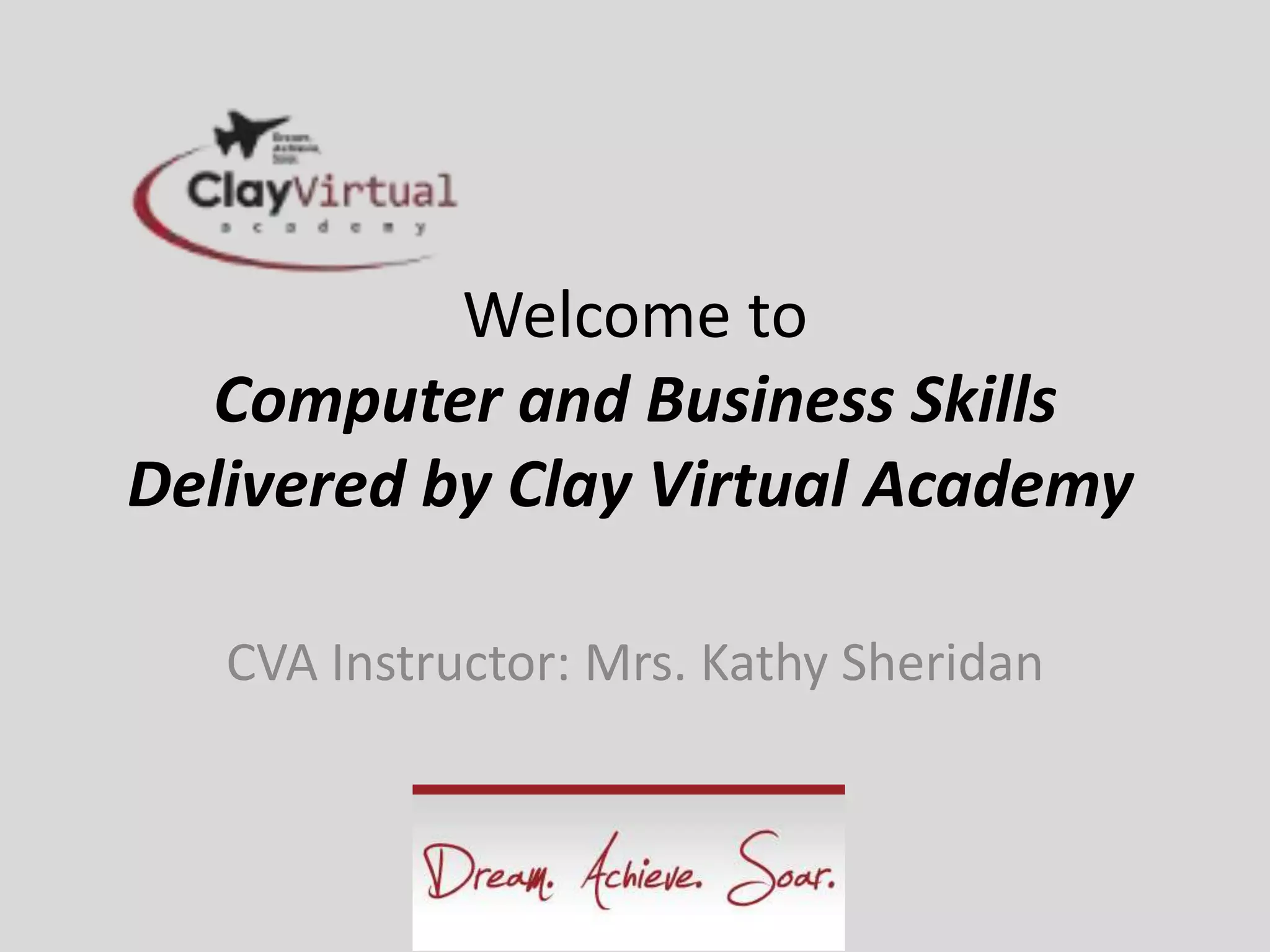 This document provides an introduction and overview for students taking a Computer and Business Skills course through Clay Virtual Academy (CVA). It introduces the principal, instructor Kathy Sheridan, and the role of the Virtual Learning Lab assistant. Expectations for students are outlined, including logging in procedures and required supplies. The course aims to prepare students for today's technology-focused workplace and college environments through developing skills in programs like word processing, spreadsheets, presentations, email and internet research.