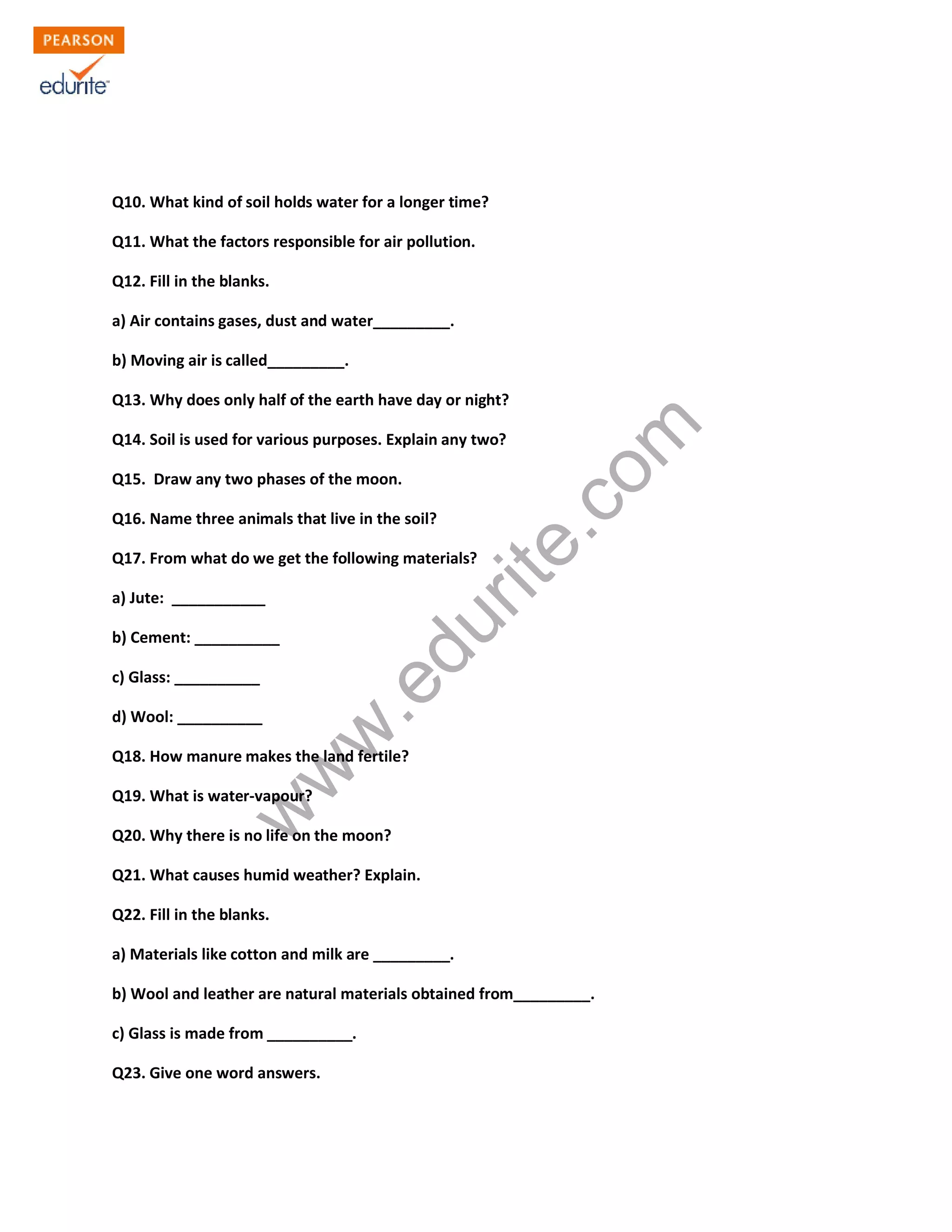 This document is a sample question paper for a 3rd-grade general science exam, consisting of 26 questions with varying mark distributions. The questions cover topics related to natural materials, soil, air pollution, phases of the moon, and breathing methods of different animals. It provides instructions on how to answer each set of questions based on their mark value.