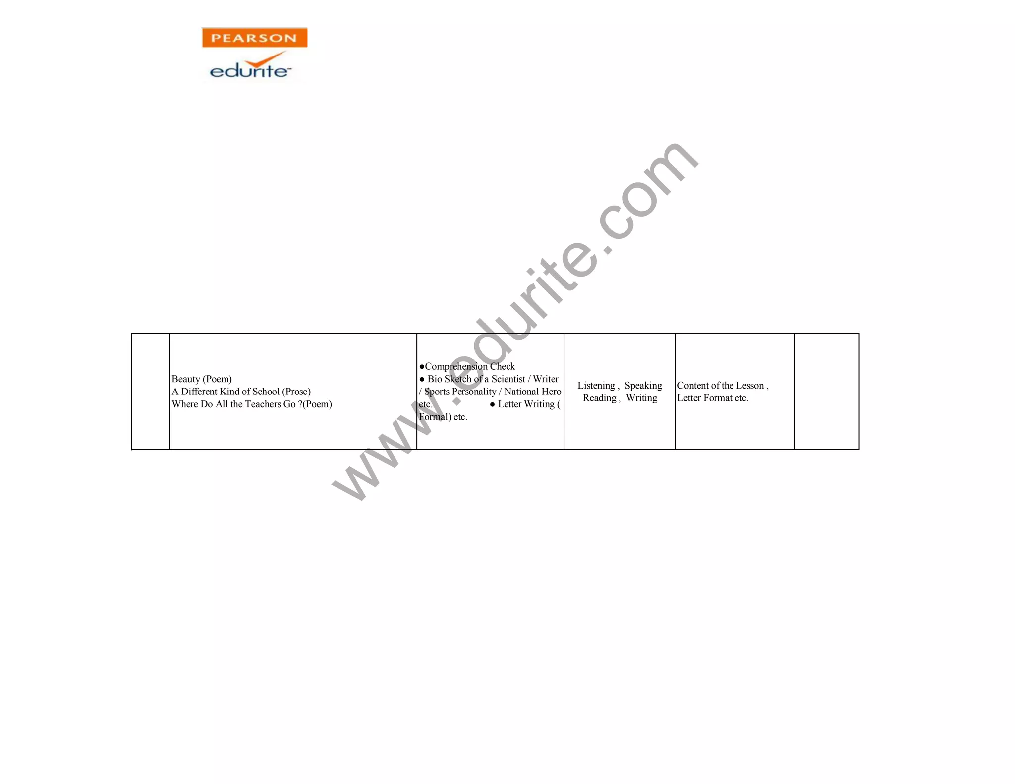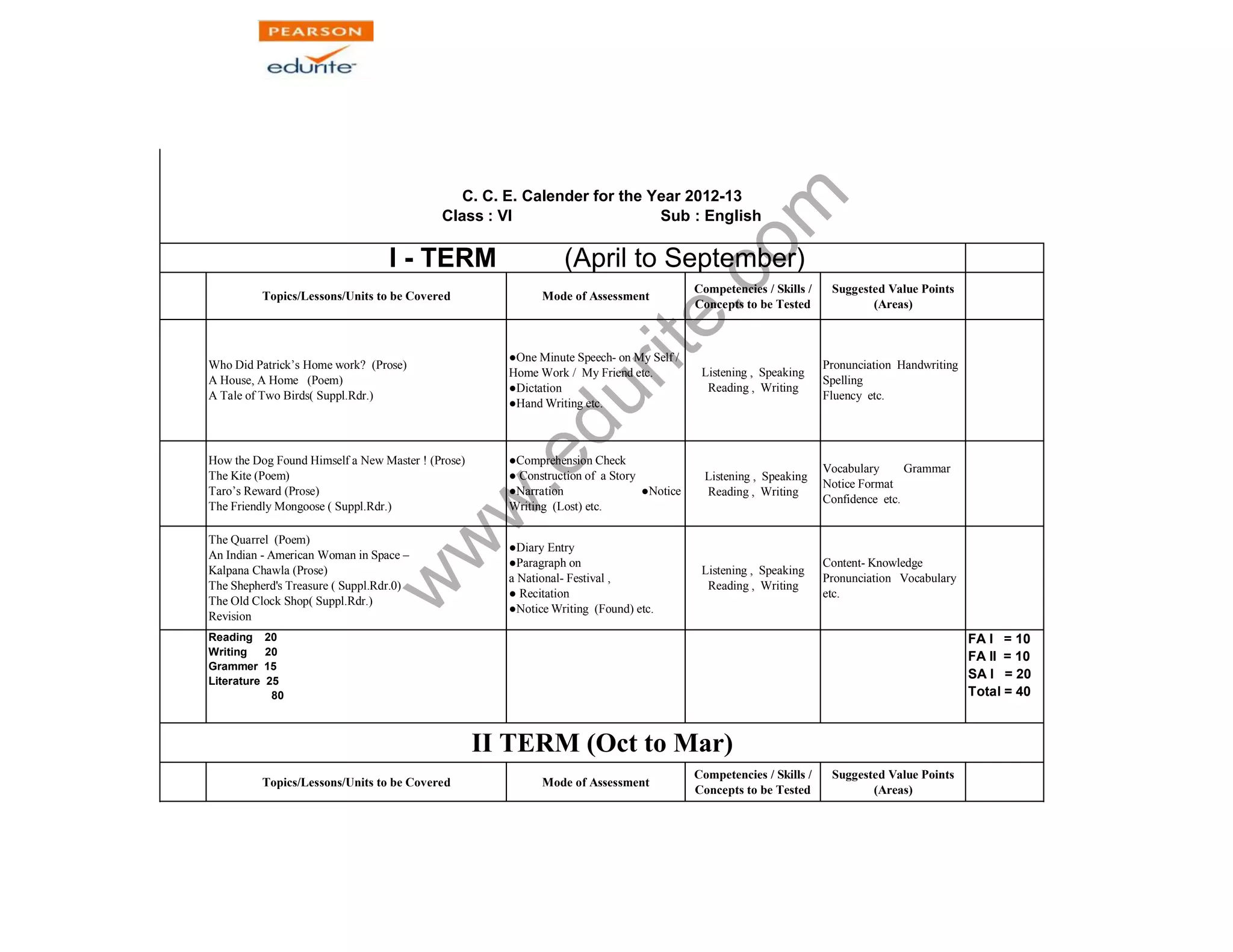 The document outlines the syllabus and assessment modes for English lessons for Class VI at Kendriya Vidyalaya, covering the period from April to September and October to March. It details various prose, poems, and supplementary readers, along with suggested activities for skills assessments in listening, speaking, reading, and writing. The syllabus also includes specific competencies and concepts to be tested, along with a breakdown of marks for different evaluation categories.