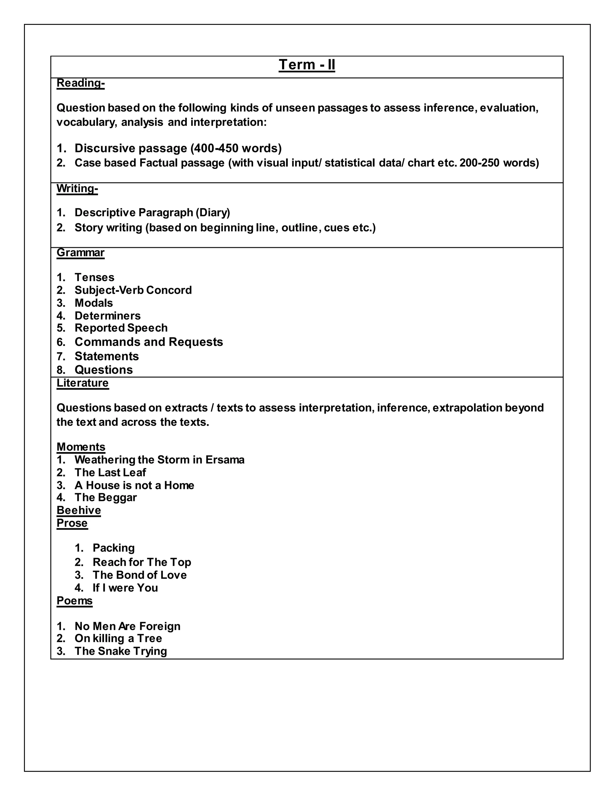 The document outlines the term-wise syllabus for English Language and Literature for Classes IX to XII for the academic year 2021-22. It includes detailed sections on reading comprehension, writing skills, grammar, and literature texts, specifying the types of passages, writing tasks, grammar topics, and literary works to be covered. Each class has a defined weightage for assessments, totaling 50 marks across various components.