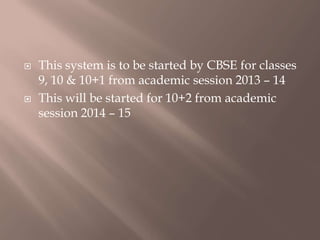 The document discusses CBSE's plan to introduce open book exams for classes 9 through 11 starting in 2013-2014. Some key points of the plan are: students will be told in advance which chapters questions will come from; 20% of the exam will be open book questions based on provided material; and the goal is to test students' ability to analyze information and apply concepts rather than rely on memorization.