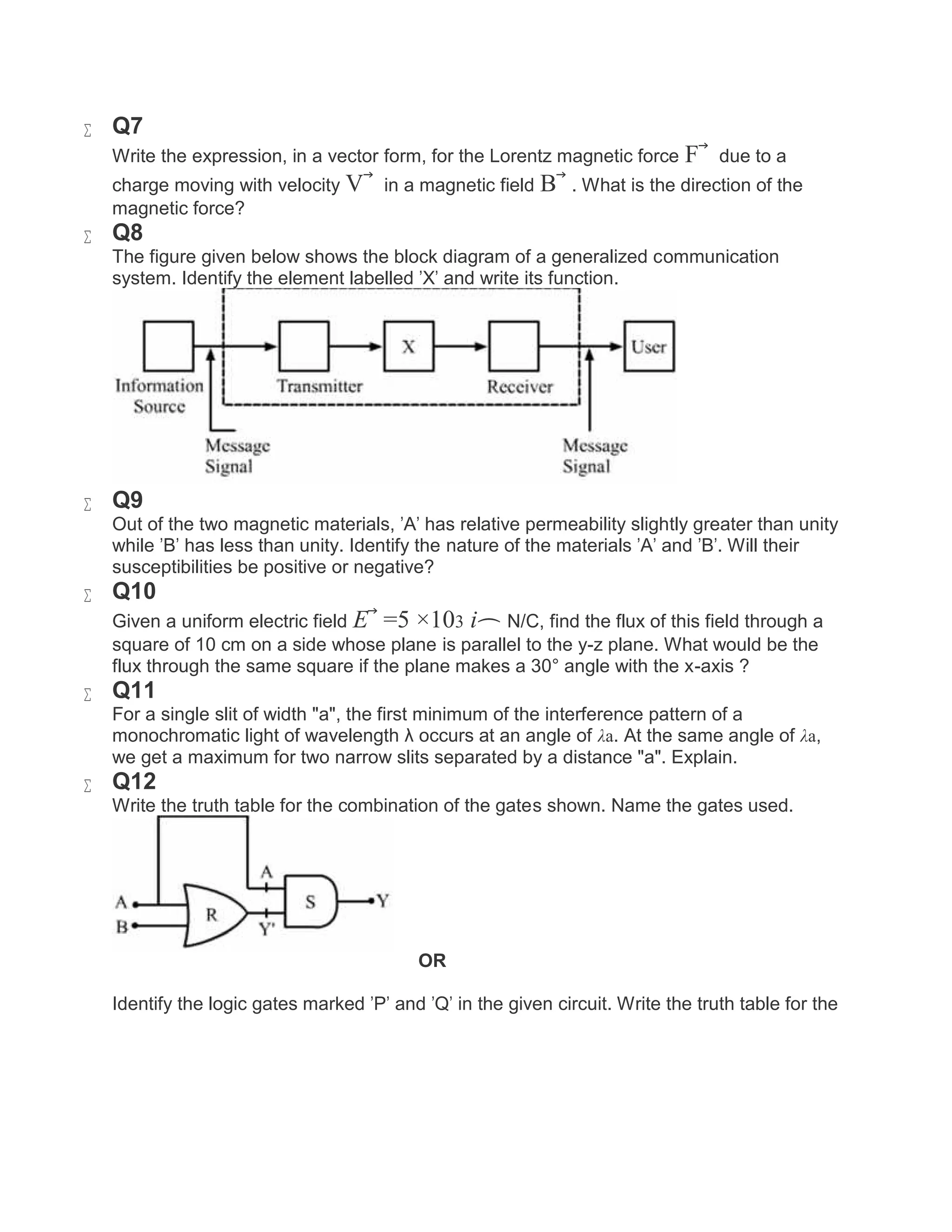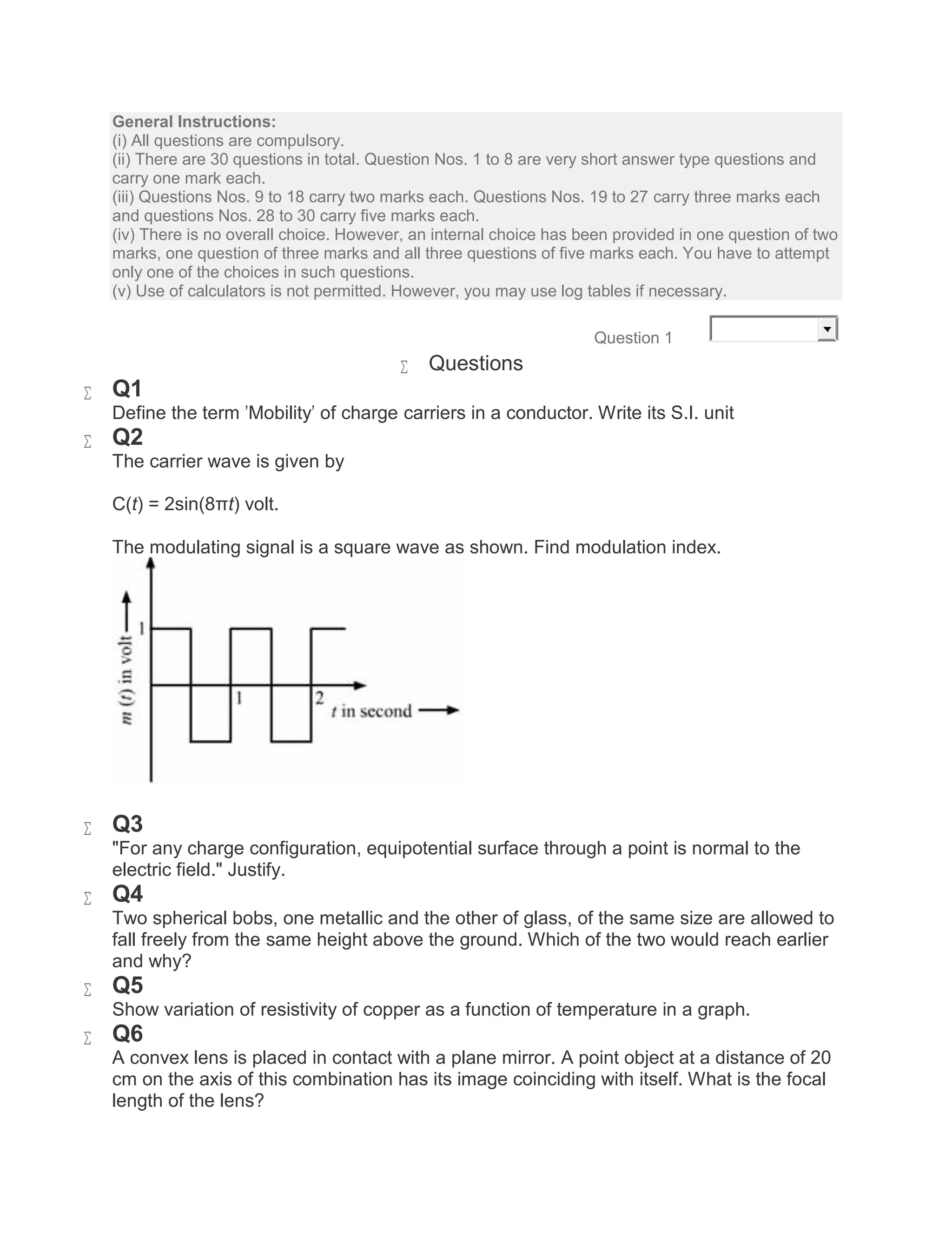 The document provides general instructions for a question paper consisting of 30 questions ranging from very short answer to long answer questions worth 1 to 5 marks each. It specifies that all questions are compulsory and there is no overall choice but internal choice in some questions. Calculators are not allowed but log tables can be used. The document then lists the 30 questions covering various topics in physics.