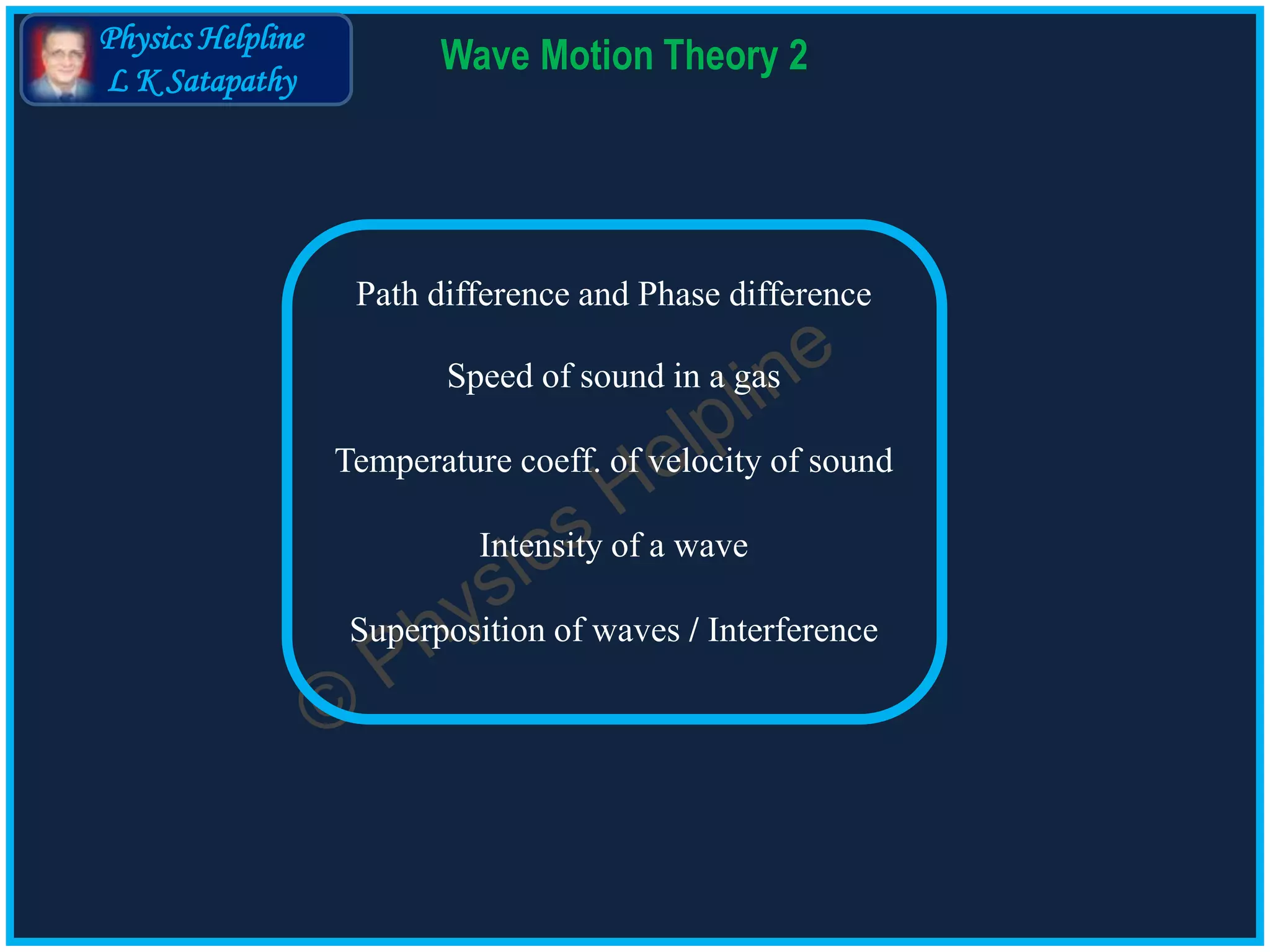 The document discusses wave motion theory, specifically focusing on the relationship between path difference and phase difference, and the speed of sound in gases. It explains Newton's law of sound propagation versus Laplace's correction for adiabatic processes, the effects of temperature, pressure, and humidity on the speed of sound, and the principles of wave superposition and interference. Additionally, it highlights the intensity of waves and their mathematical representation, providing a comprehensive overview of the key concepts in wave dynamics.