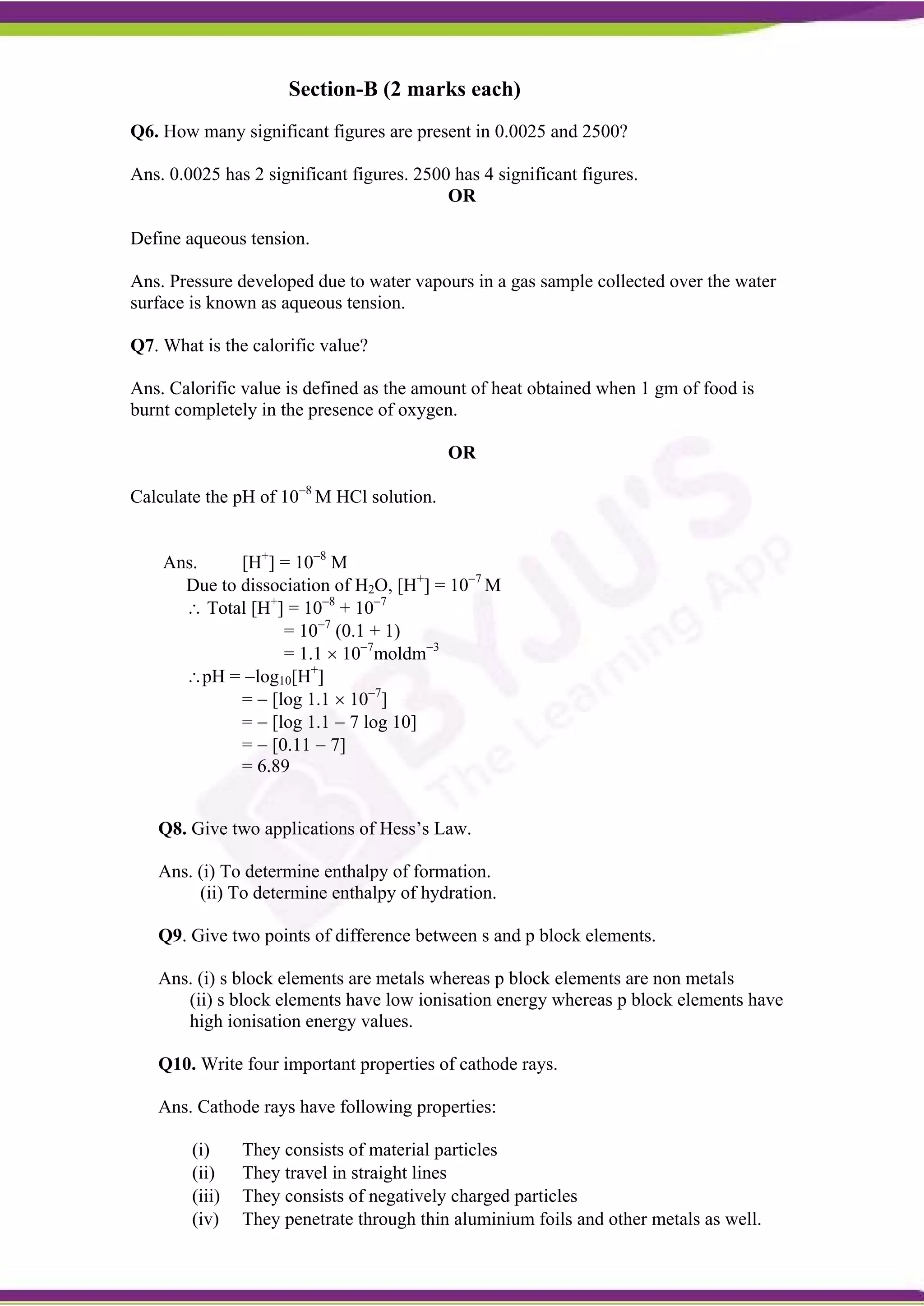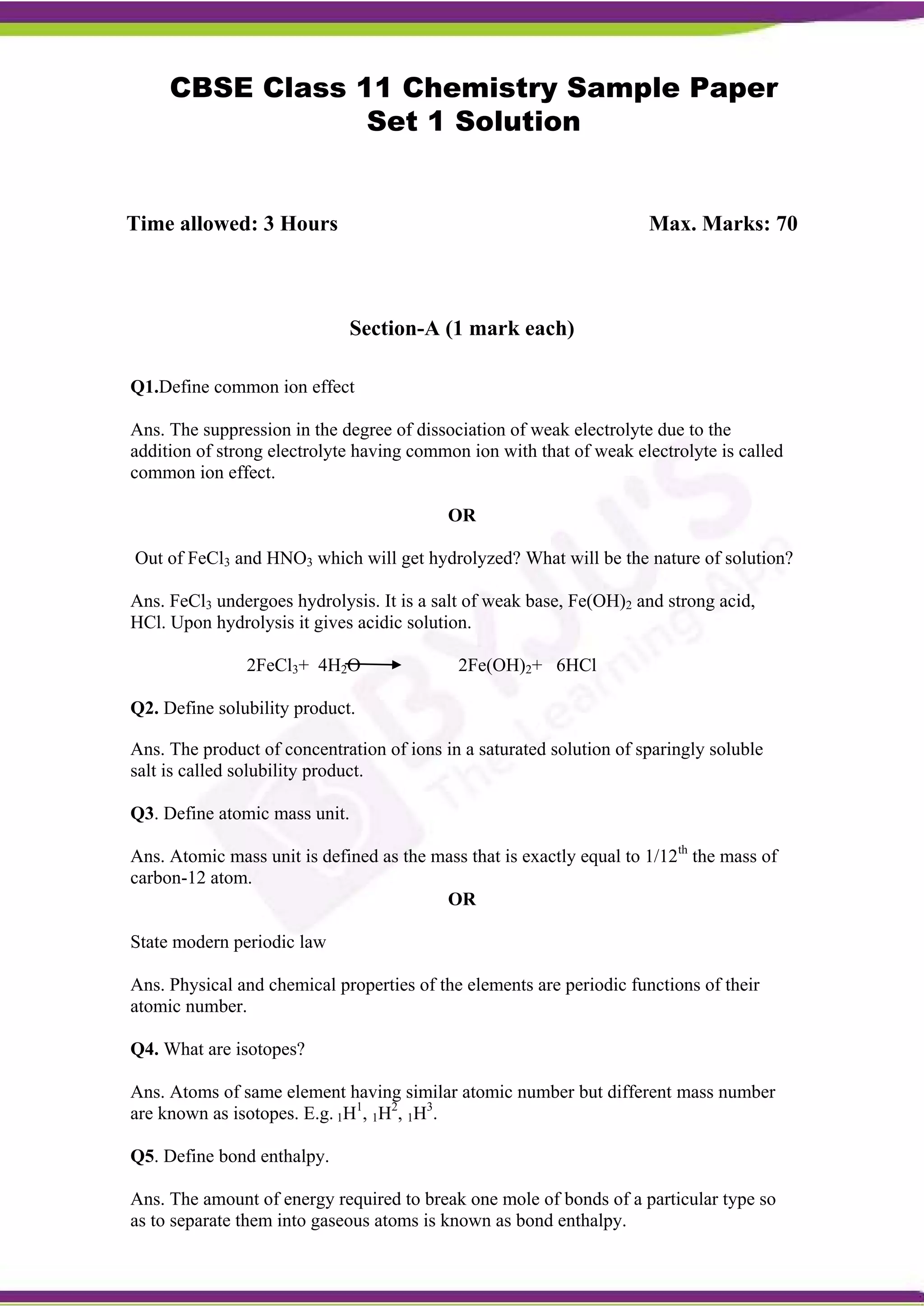 The document is a sample chemistry exam paper with multiple choice and long answer questions testing concepts in chemistry. It contains 22 questions across 4 sections (Section A-D) with varying point values. The questions cover topics such as common ion effect, solubility product, atomic mass unit, isotopes, bond enthalpy, significant figures, pH calculations, Hess's law, VSEPR theory, cathode ray properties, and more. The final section includes 5 mark questions requiring explanations on topics like Markownikoff's rule, diborane structure, and differences between ionic and covalent bonds.