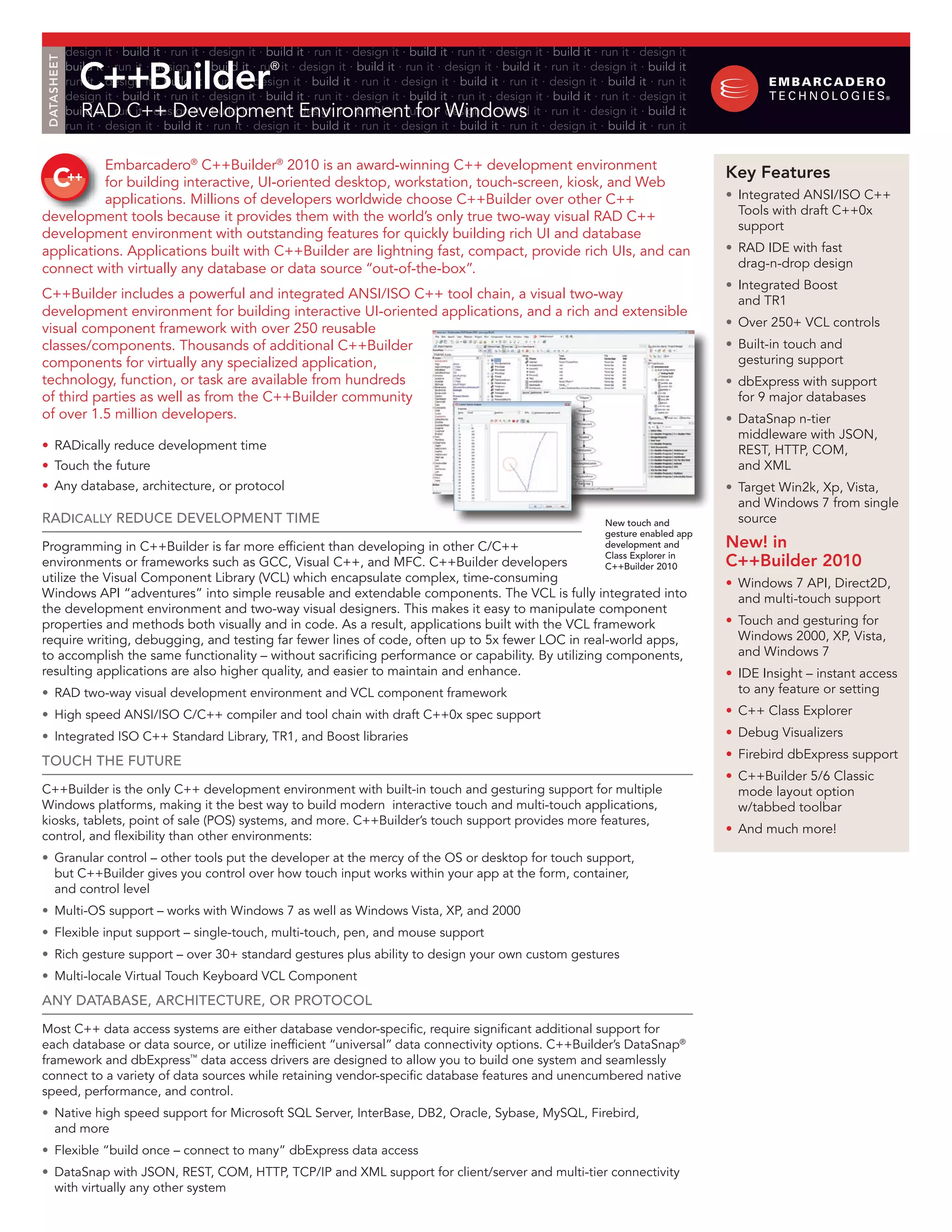 C++Builder is a visual RAD development environment for building desktop and mobile applications in C++. It includes a visual form designer, integrated IDE, C++ compiler, libraries, and over 250 reusable UI components. C++Builder simplifies development by encapsulating complex Windows APIs into reusable components. It also provides connectivity to all major databases and supports touch, gestures, and mobile development for Windows platforms. Additional editions provide enhanced database support, web development, UML modeling, and database design tools.
