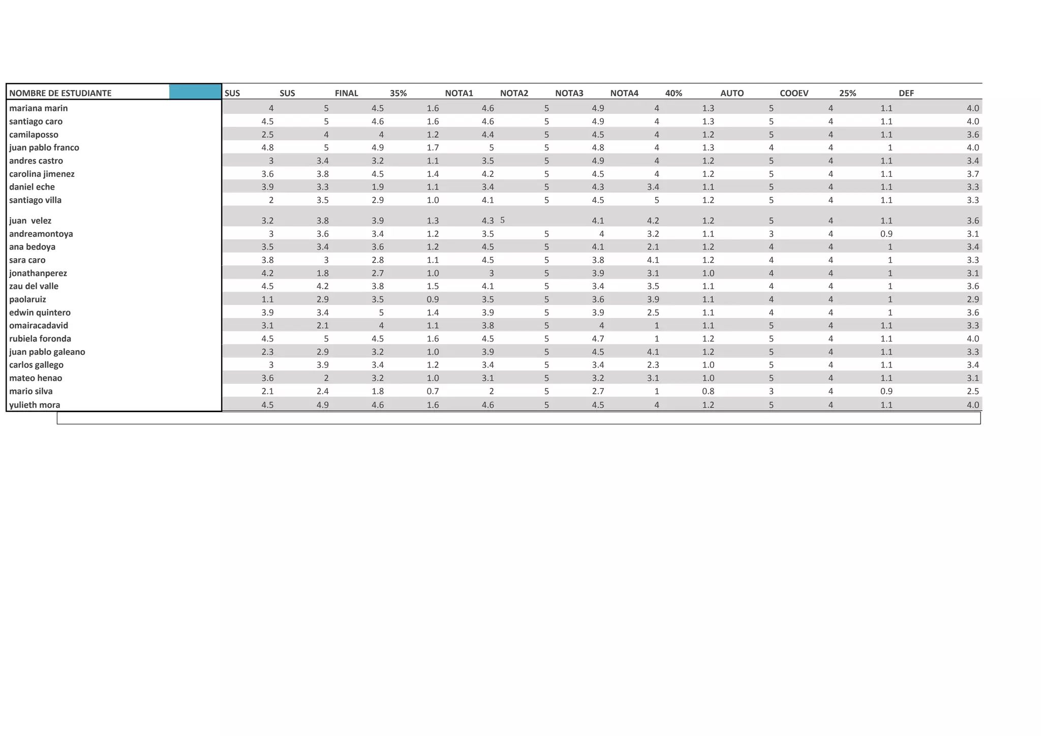 This document contains the grades of various students in different subjects and assignments. It lists the student names and their grades in 5 assignments (35%), an auto-evaluation (40%), and a final evaluation (25%). The highest grades are 5 and the lowest are 1. Some top performing students included Mariana Marin, Santiago Caro, and Yulieth Mora who achieved overall grades between 4.0-4.0.