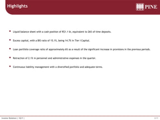 The document summarizes the 1Q17 earnings release of Pine Bank. Key highlights include: