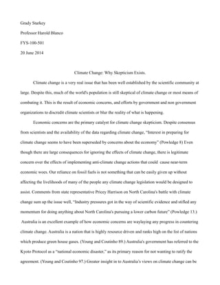 While climate change is established scientifically, skepticism remains due to economic concerns and intentional efforts to discredit climate scientists. Economic issues are the primary reason for skepticism as transitioning away from fossil fuels could harm industries and livelihoods. Governments and groups intentionally aim to undermine the credibility of climate science and the IPCC to protect economic interests reliant on fossil fuels. As long as fossil fuels remain more economically viable than alternatives, it will be difficult to convince skeptics without a public consensus on the reality and impacts of climate change.