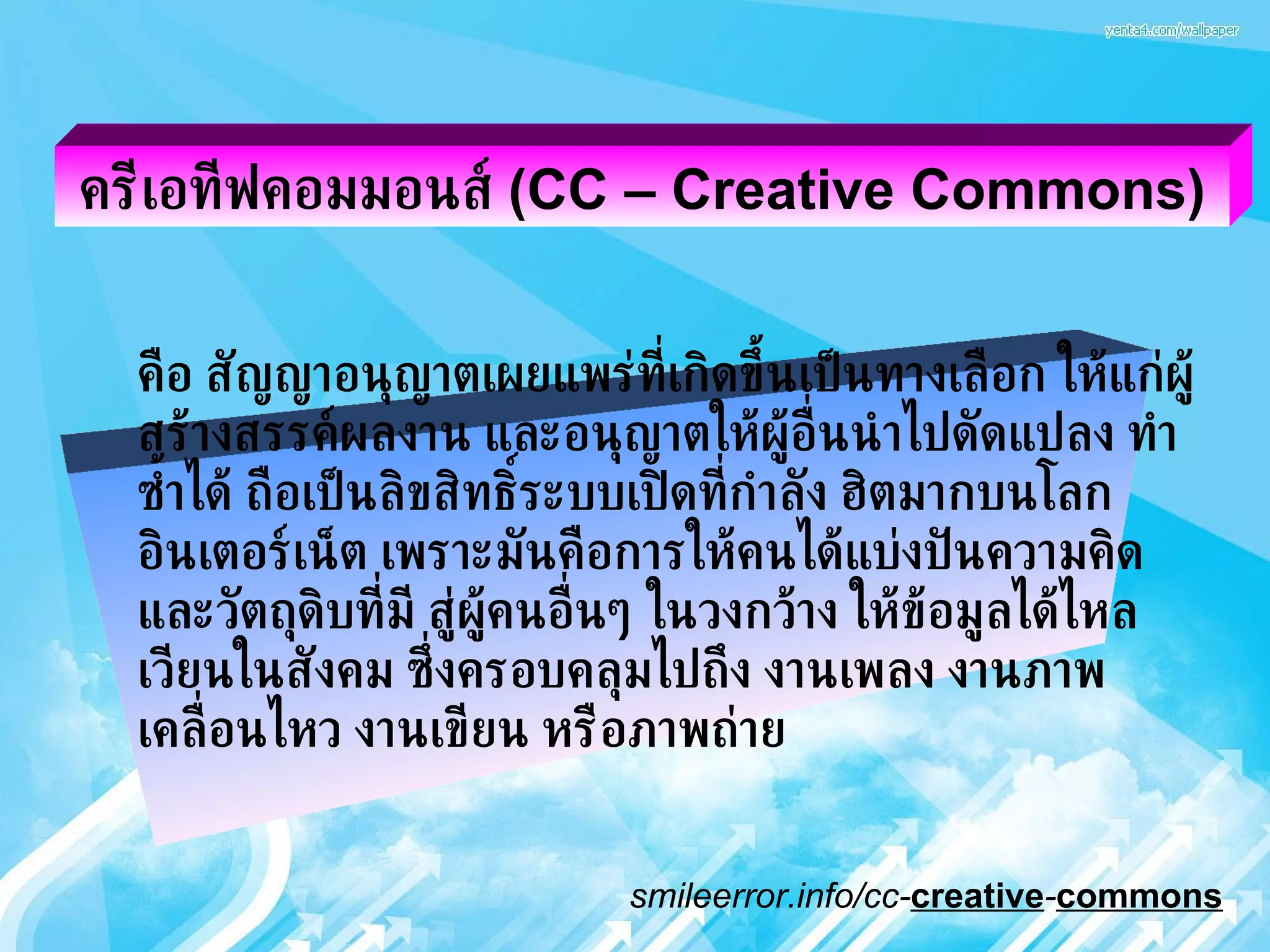 “ แต่ทั้งนี้ทั้งนั้น การนำ CC มาใช้ ลิขสิทธิ์ยังเป็นของเจ้าของ หรือผู้สร้างสรรค์อยู่ คนที่นำไปใช้ ต้องให้เครดิตกับเจ้าของงานด้วย ถือเป็นเรื่องความชอบธรรม ที่ควรทำและต้องยอมรับ ซึ่งมันเป็นสิ่งที่ทำได้ไม่ยาก” ข้อคิดจาก เครือข่ายครีเอทีฟคอมมอนส์ประเทศไทย smileerror.info/cc- creative - commons - 7.