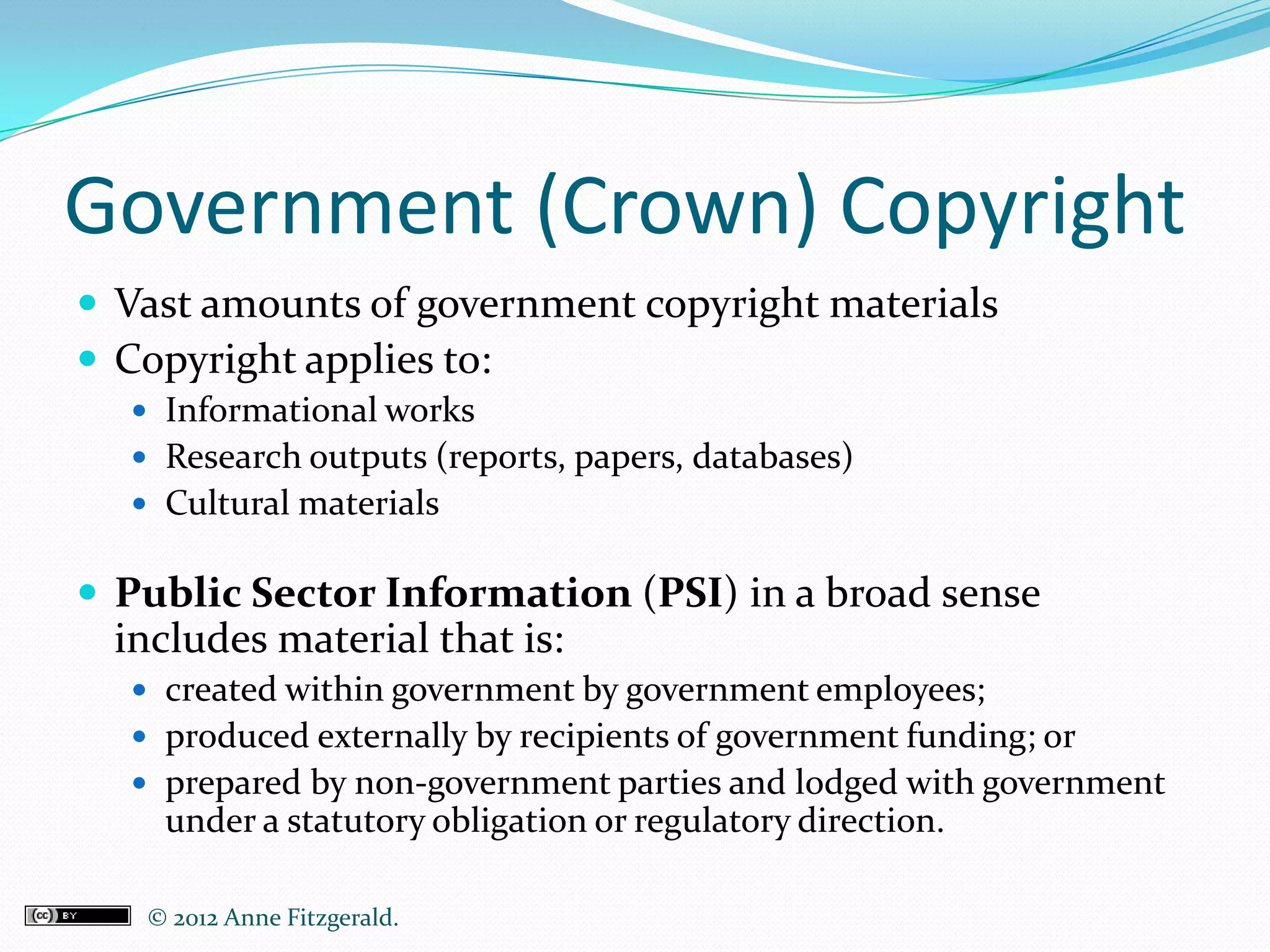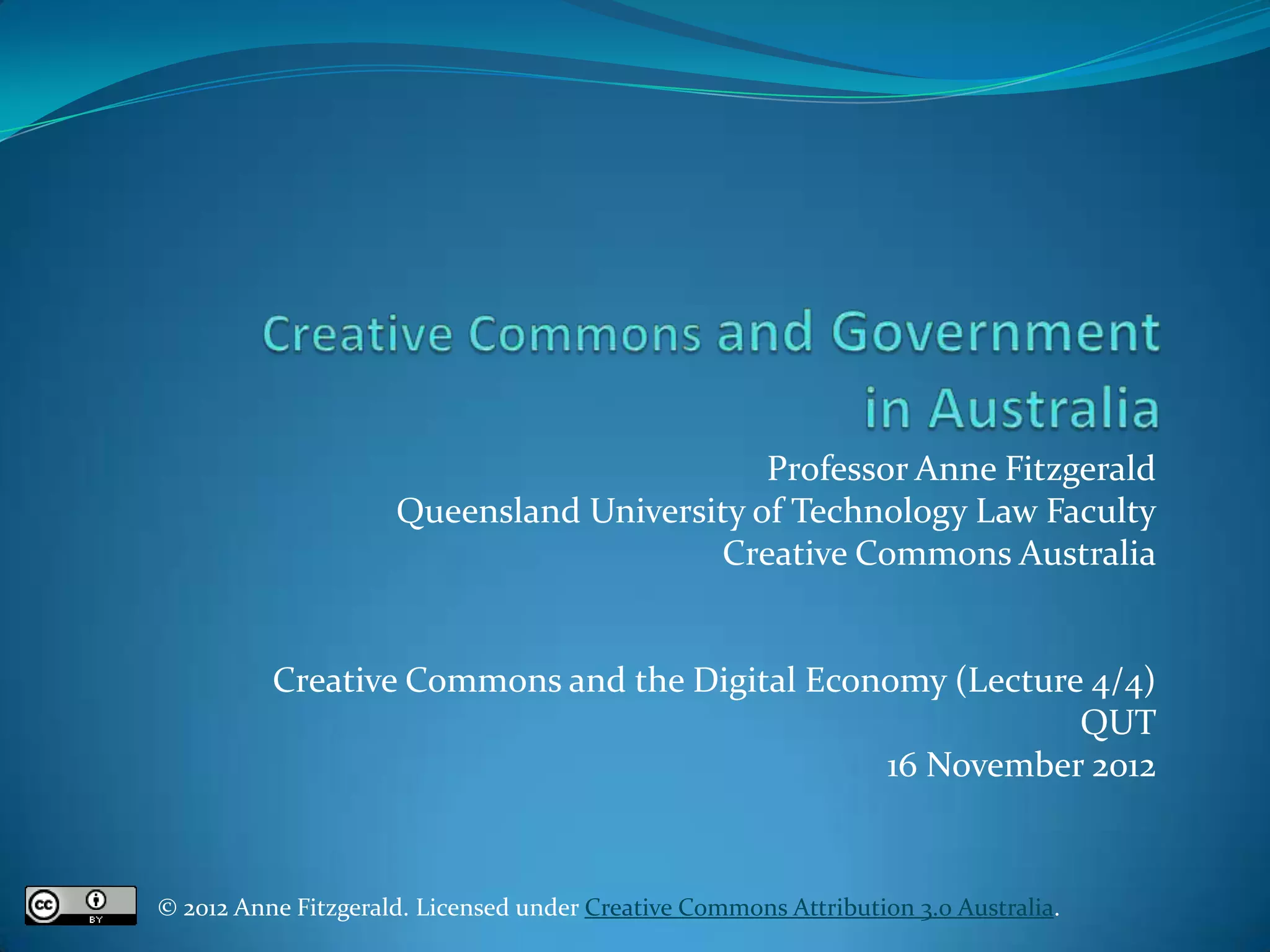 This document summarizes a lecture about Creative Commons and the digital economy given by Professor Anne Fitzgerald at Queensland University of Technology Law Faculty. It discusses the application of Creative Commons licensing to public sector information and government copyright materials. It provides background on how Creative Commons has come to be applied to public sector information in Australia over time, through various government reviews and reports recommending more open access and reuse of public data and content.