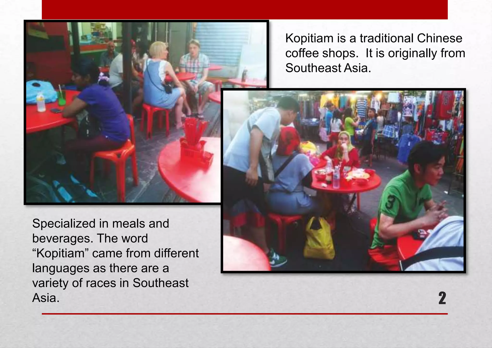 Kopitiam is a traditional Southeast Asian coffee shop originating in Malaysia. The document discusses Kopitiam and provides details on 5 famous Kopitiams in Kuala Lumpur known for their traditional style. Kopitiams serve typical dishes and drinks like fried kuey teow, half boiled eggs, ice milo, and are decorated with items like Chinese scrolls, old tiles, and arrange tables and chairs. They cater to the multi-racial population of Malaysia with influences from Hokkien, Malay, and other Southeast Asian languages in their name and offerings.