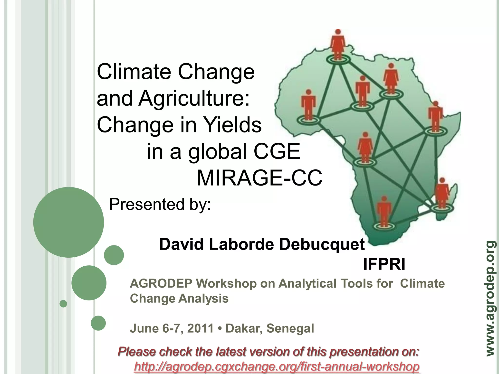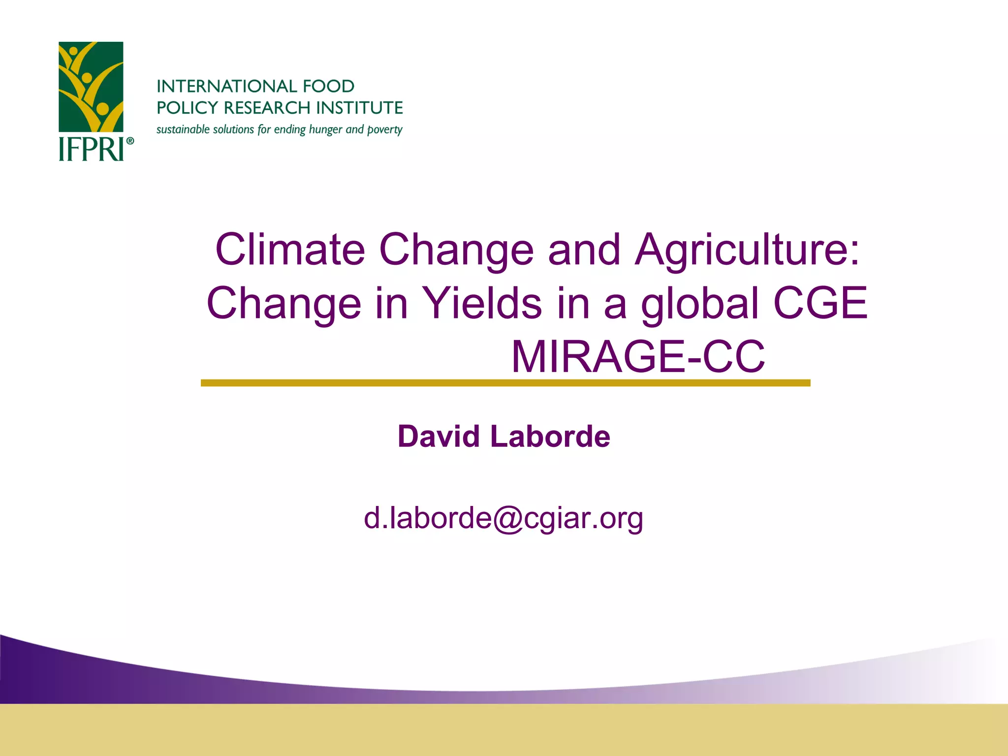 The document presents research on the impact of climate change on agricultural yields using the MIRAGE-CC model, focusing on the effects of temperature and rainfall. It discusses trade policy implications, economic responses, and the variability of yield changes across different crops and regions, highlighting uncertainties and the need for effective communication with policymakers. Conclusively, it emphasizes the limited macroeconomic effects of climate change on average yields, while stressing the importance of addressing distributional impacts on poorer populations.