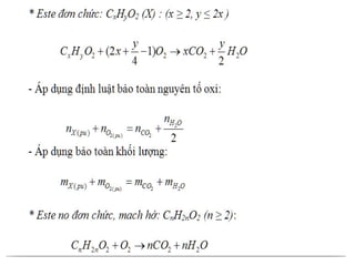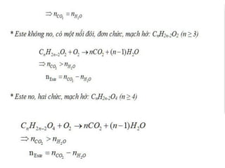 Tài liệu trình bày các bài tập liên quan đến este, bao gồm cách đốt cháy và thủy phân este với sự áp dụng của các quy tắc bảo toàn khối lượng và nguyên tố. Các bài tập cũng đề cập đến việc tính toán công thức phân tử của este dựa trên các sản phẩm phản ứng và sử dụng phương pháp xà phòng hóa. Thông qua các ví dụ, tài liệu minh họa các phản ứng hóa học và cách xác định thành phần của este.