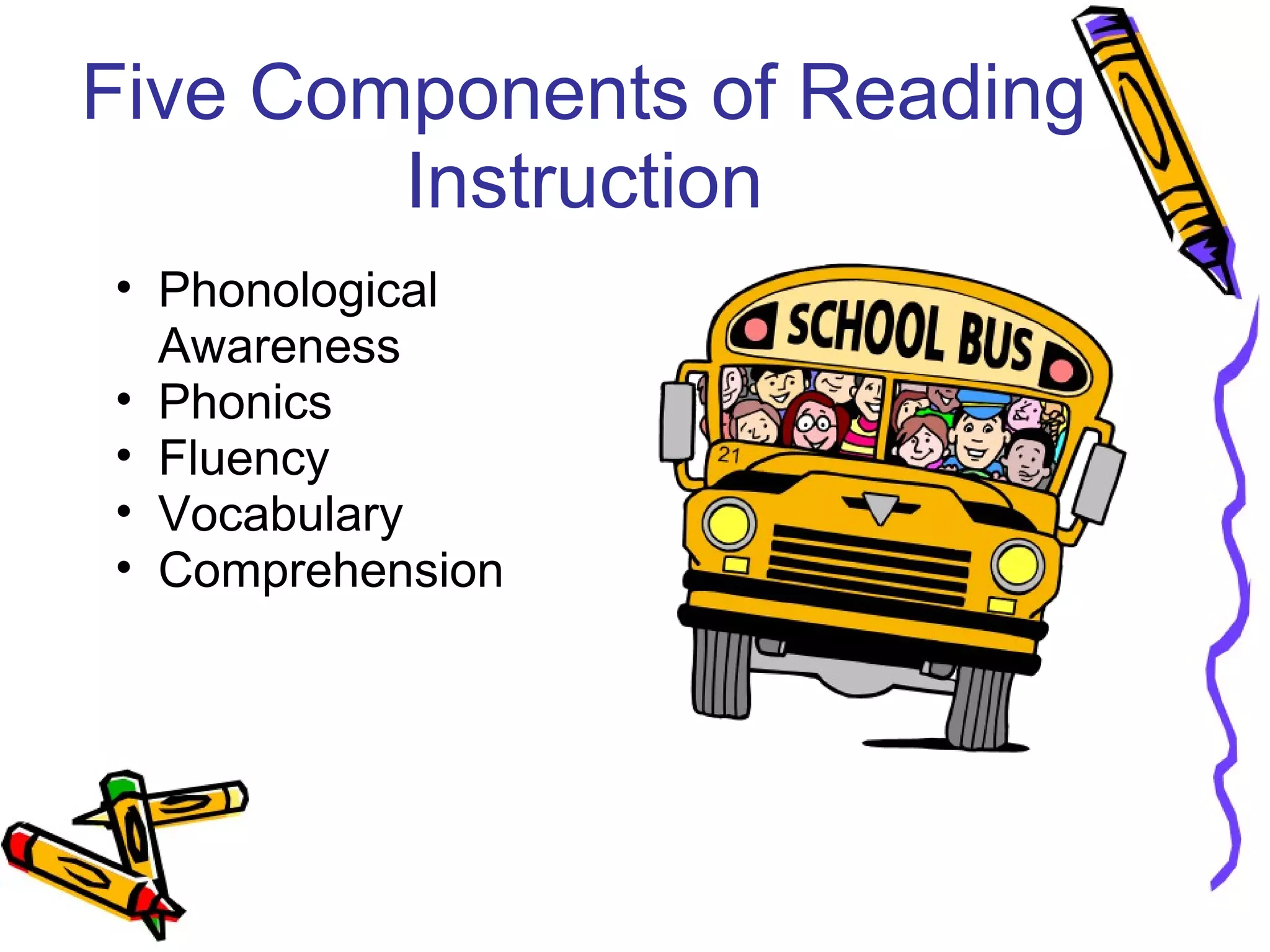 The document discusses five components of reading instruction: phonological awareness, phonics, fluency, vocabulary, and comprehension. It provides details on phonological awareness training, enhancing effectiveness, phonemic awareness activities, teaching phonics through letter-sound correspondence and sounding out words. The document also discusses enhancing fluency, direct vocabulary instruction, comprehension strategies, and six core developmental reading approaches: basal reading, literature-based reading, whole language, language experience, phonics, and linguistic word families and onset-rime. Additionally, it mentions several other reading instructional methods.