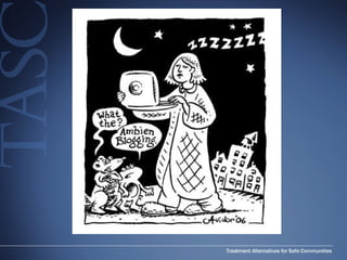 The document discusses trends in adolescent drug use, highlighting reduced use of traditional street drugs but increased use of prescription and over-the-counter medications. It outlines various classes of opiates, their effects, and the risks associated with new drugs, particularly focusing on the misuse of ADHD medications like Adderall and the dangers of substances like dextromethorphan. Additionally, it reviews the addictive potential and side effects of common sedatives and hypnotics such as Ambien, Lunesta, and Rozerem.